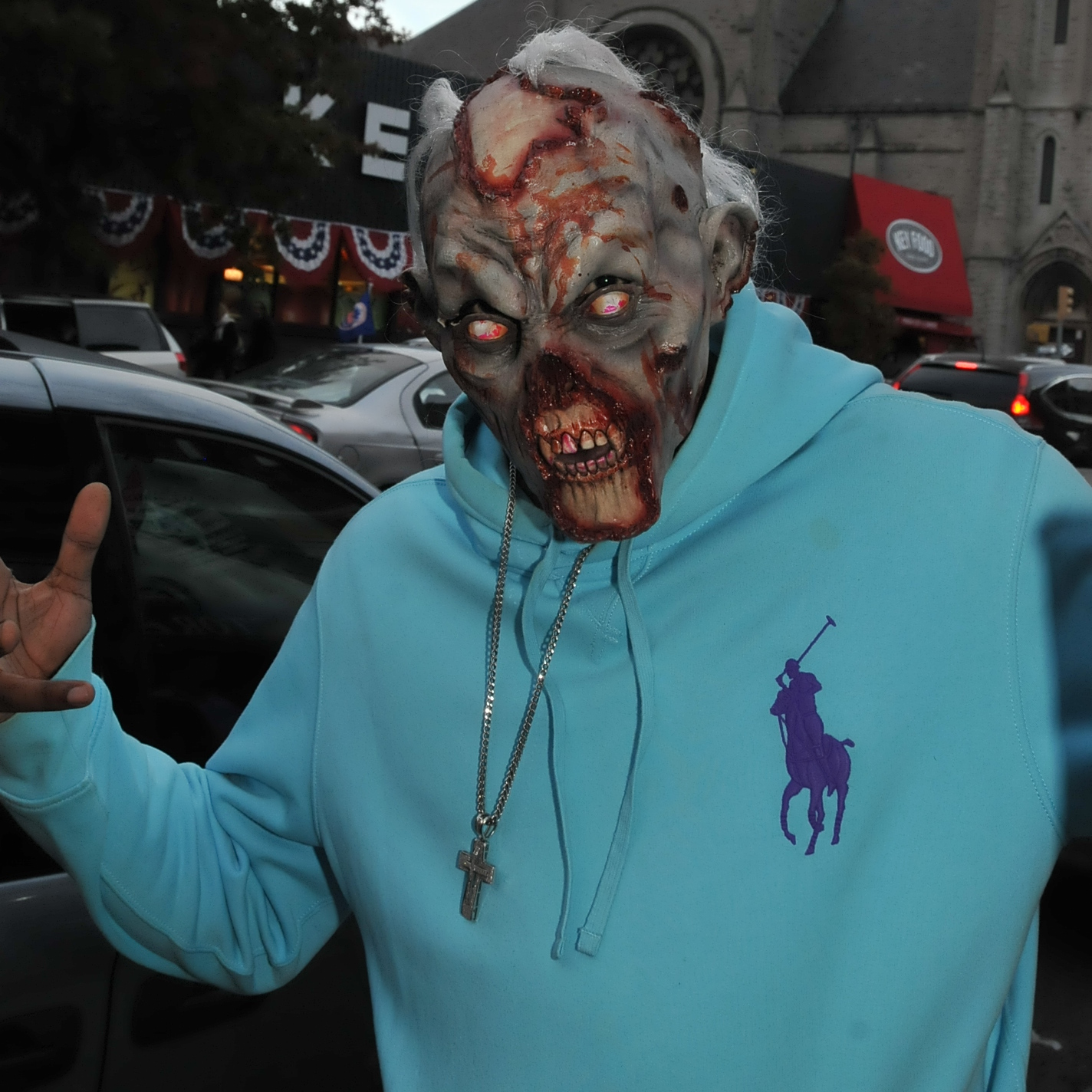5:22 PM. A zombie mask. The mask continues down the chest with gory scars, but covered by his sweatshirt here.