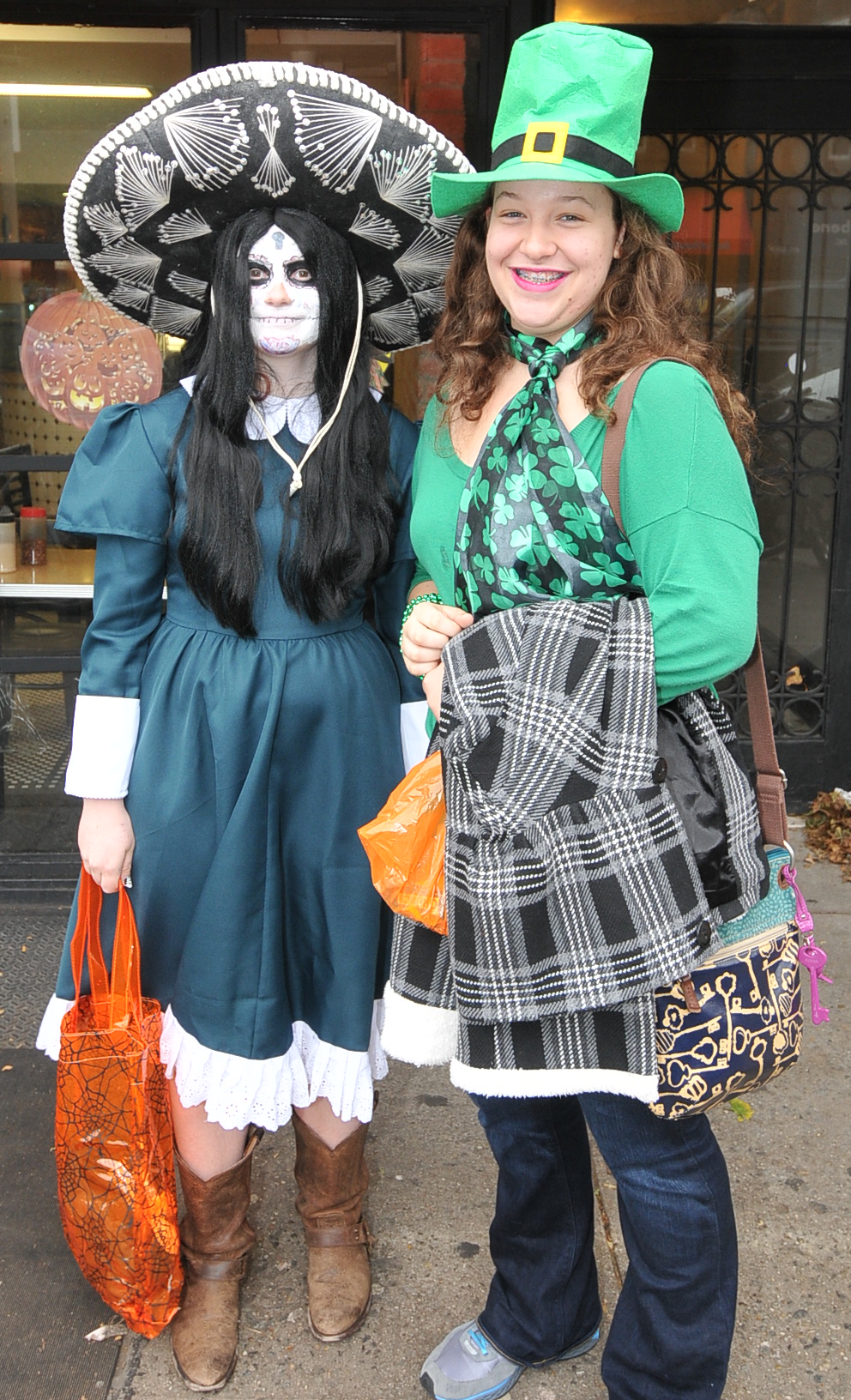 3:29 PM. La Catrina-inspired costume associated with the Mexican holiday Día de los Muertos, or Day of the Dead. With a leprechaun.