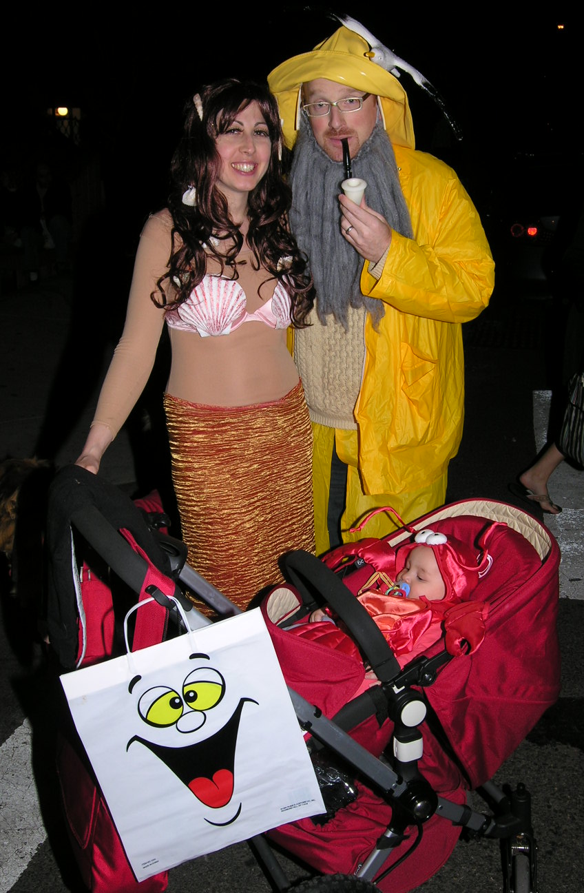 6:49 PM. A mermaid and fisherman, with a little lobster in a carriage.