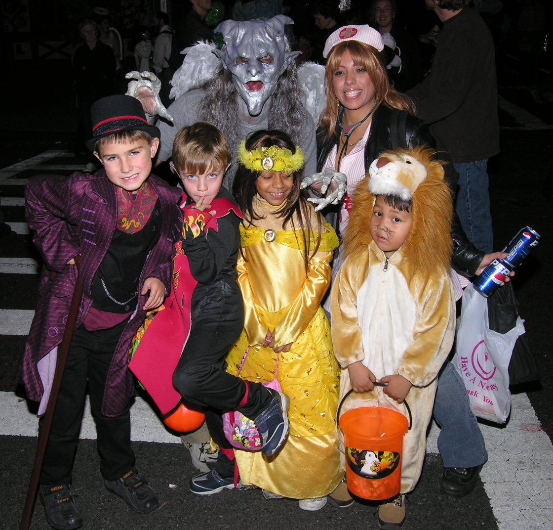 7:10 PM. Group with various costumes. In back, a devil or from Beauty and the Beast and a nurse. In front, a magician, ?, ?, and lion.