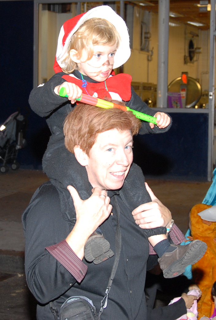 6:33 PM. A little Dr. Seuss's Cat in the Hat being carried by mom.