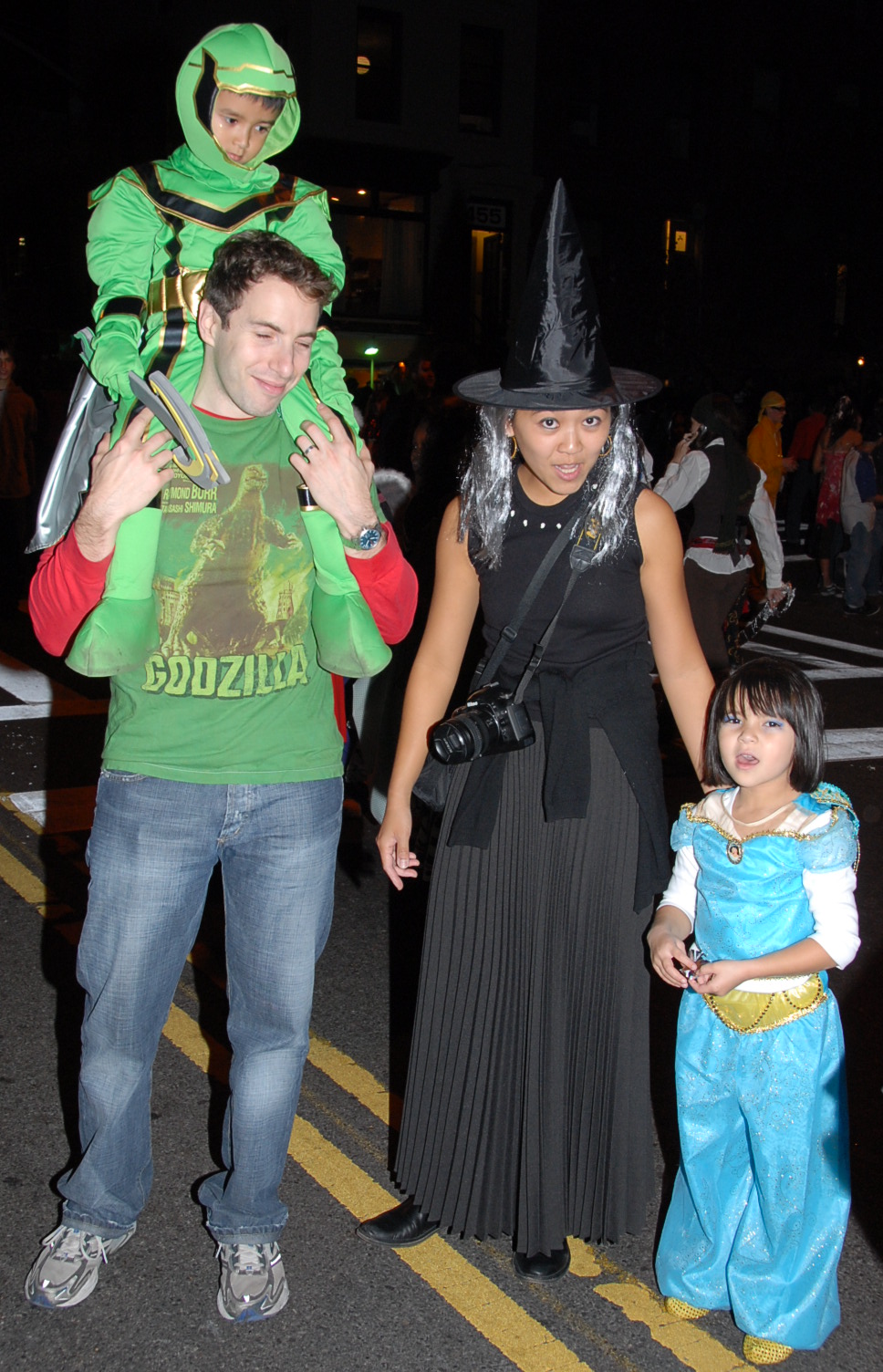 6:53 PM. Power Ranger on father's shoulders, a witch and Princess Jasmine from the Disney film Aladdin.