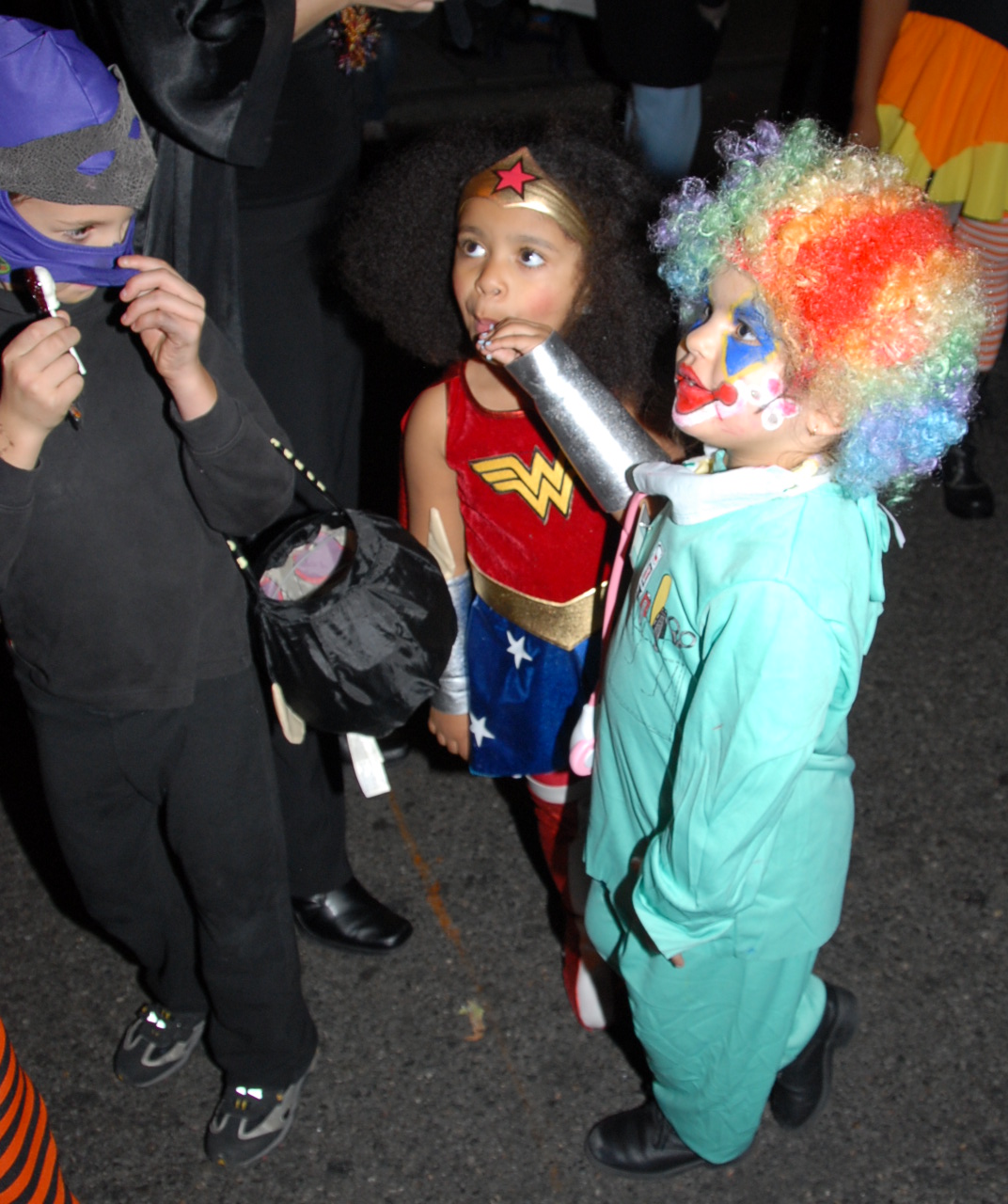 6:55 PM. Wonder Woman and a medical resident clown. At left unknown.