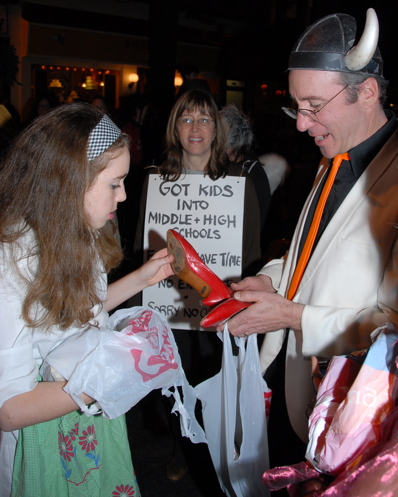 , her red shoes, a man wearing a Viking-style helmet, a woman holding a sign "Got kids into Middle + High Schools. ..."