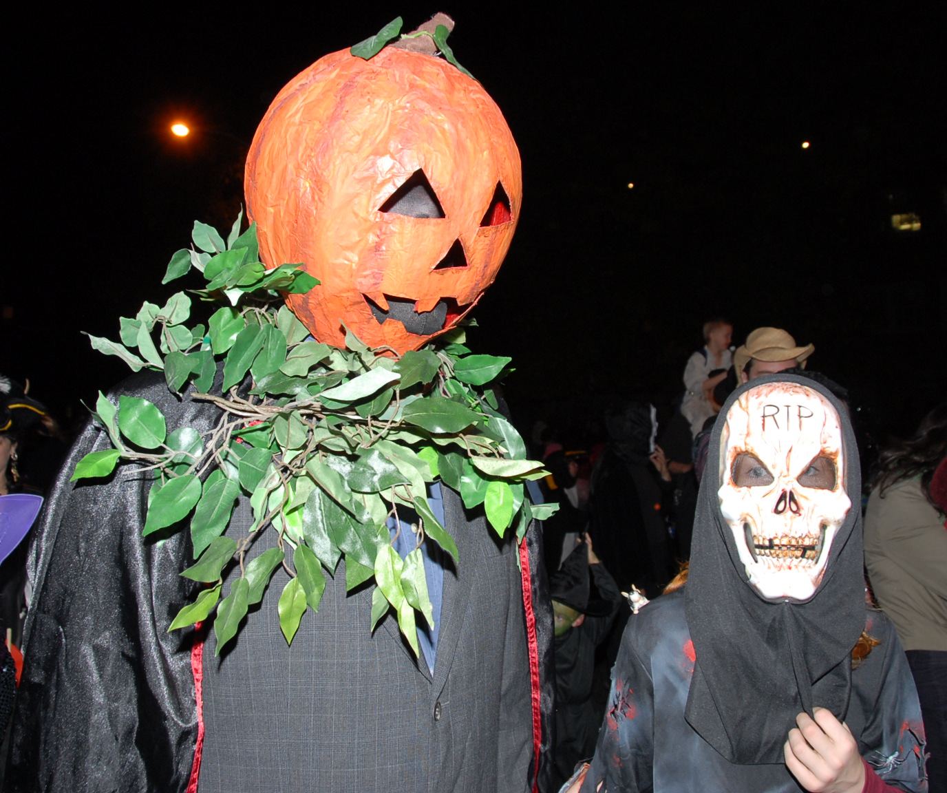 7:20 PM. A cemetery: pumpkin growing in a patch, and a skeleton that got out of a grave.
