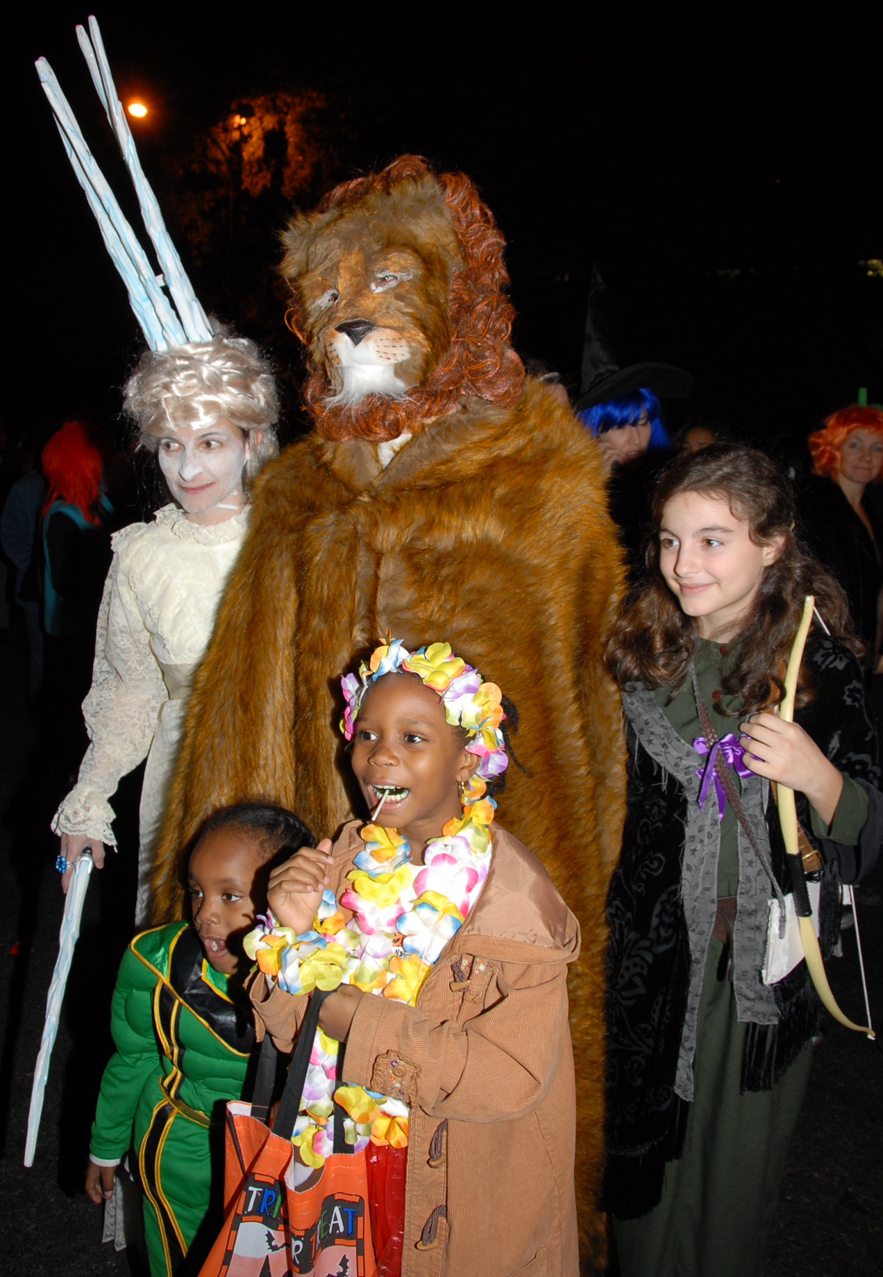 characters: Glinda the Good Witch, Cowardly Lion and Dorothy in front. Little boy is ? super hero.