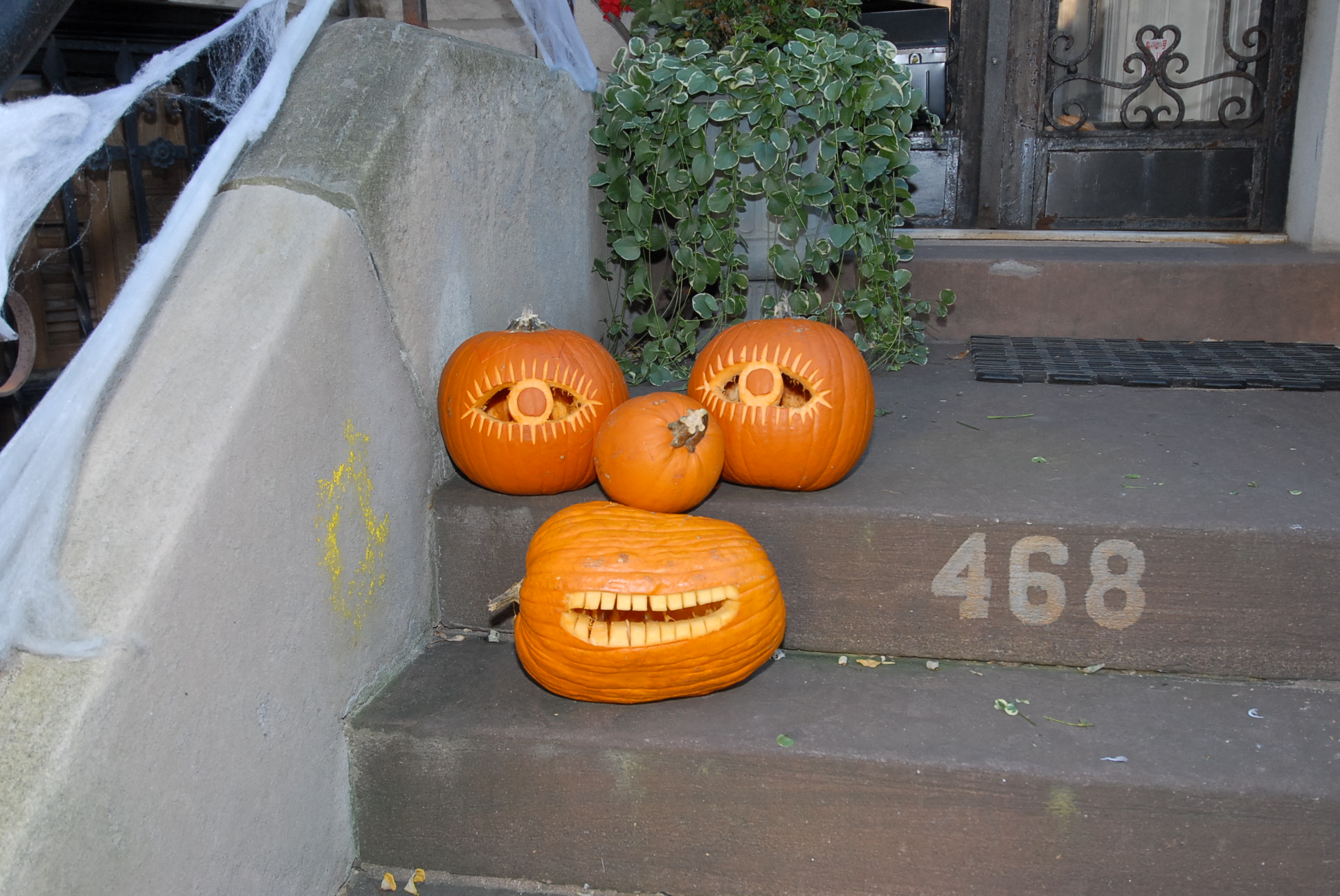 4:02 PM. A stoop down the street from me. Four pumpkins to make one jack-o'-lantern face.