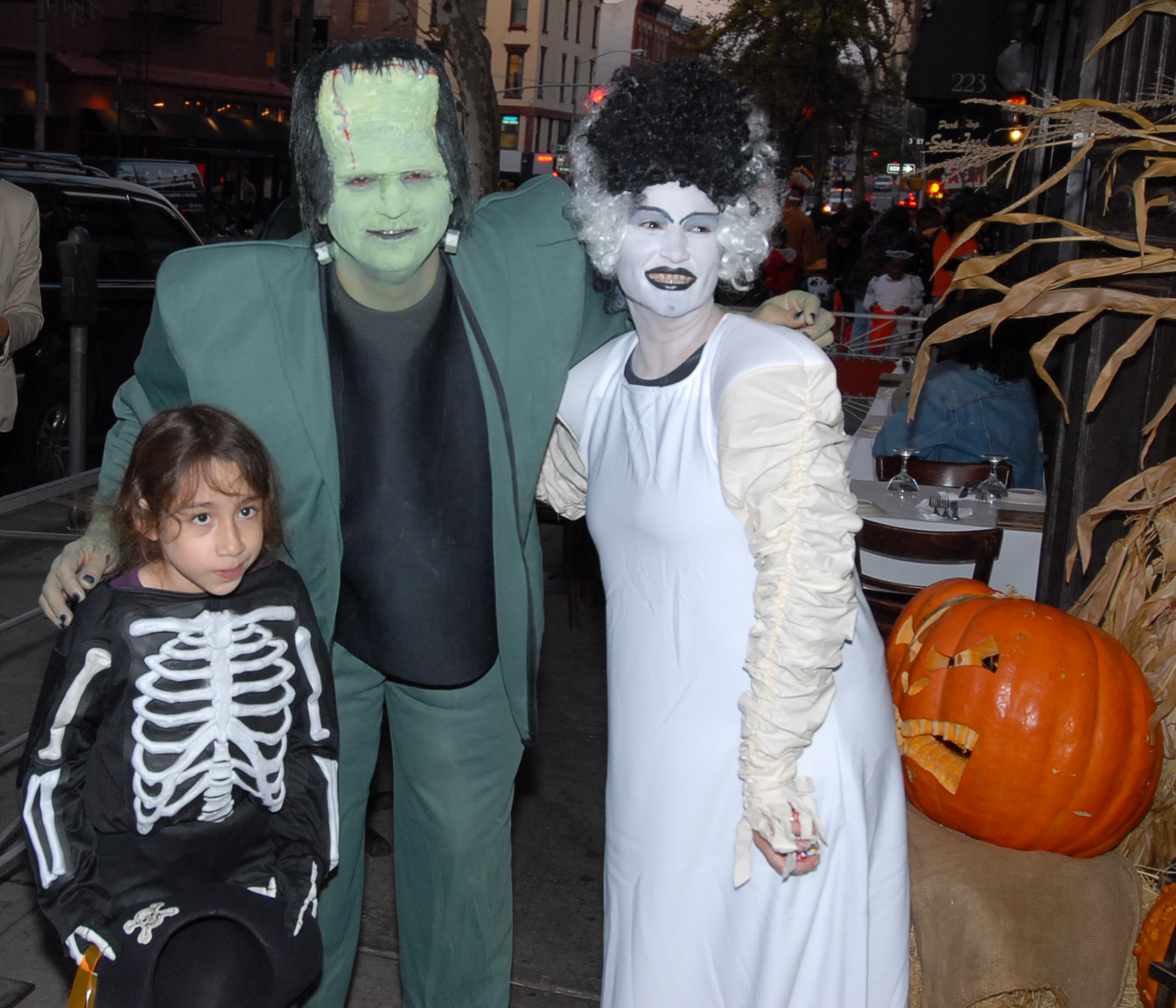 5:57 PM. A skeleton, Frankenstein and Bride of Frankenstein.