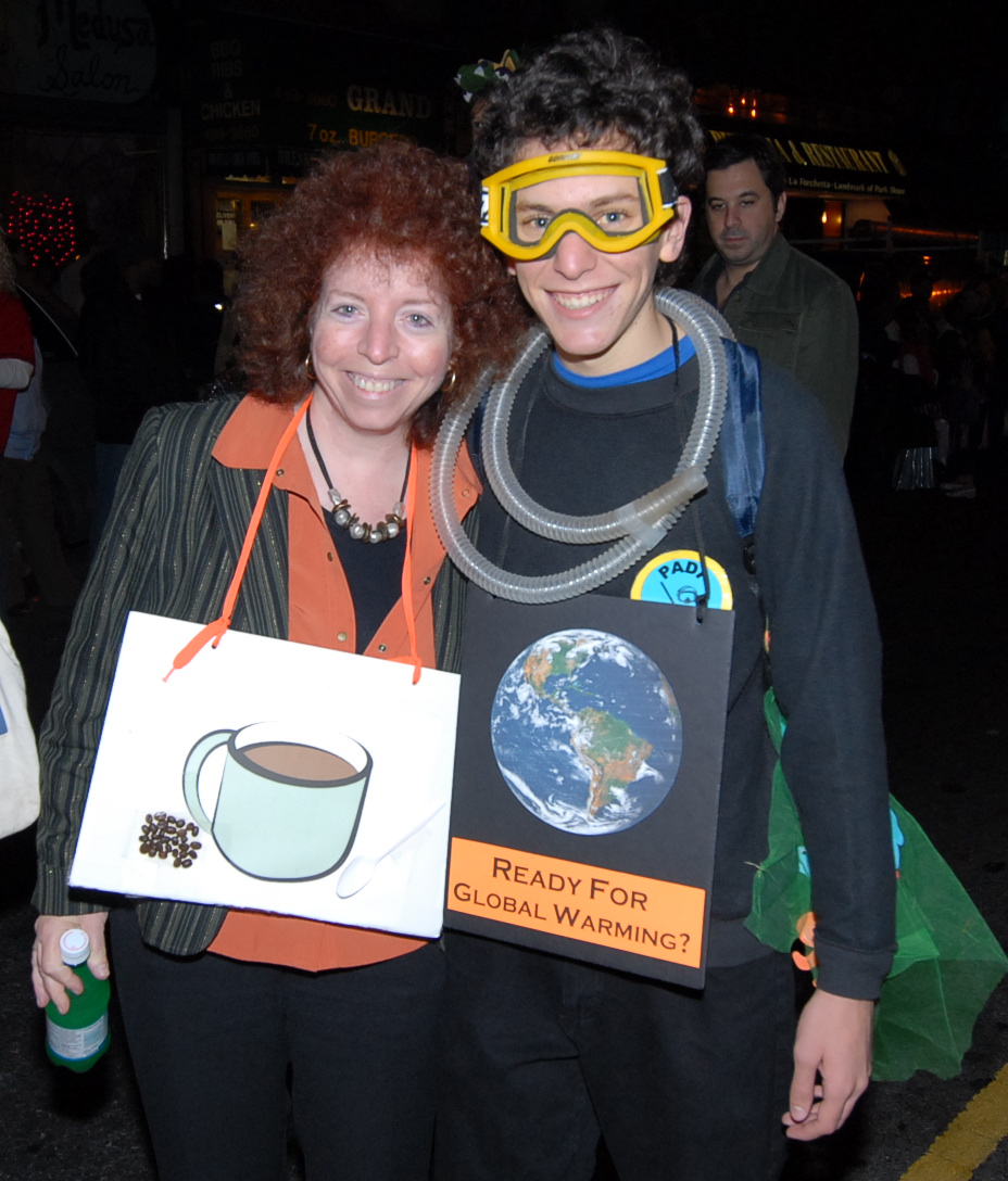 7:03 PM. Ready for Global Warming? Costumes are a coffee cup with beans and SCUBA diver.