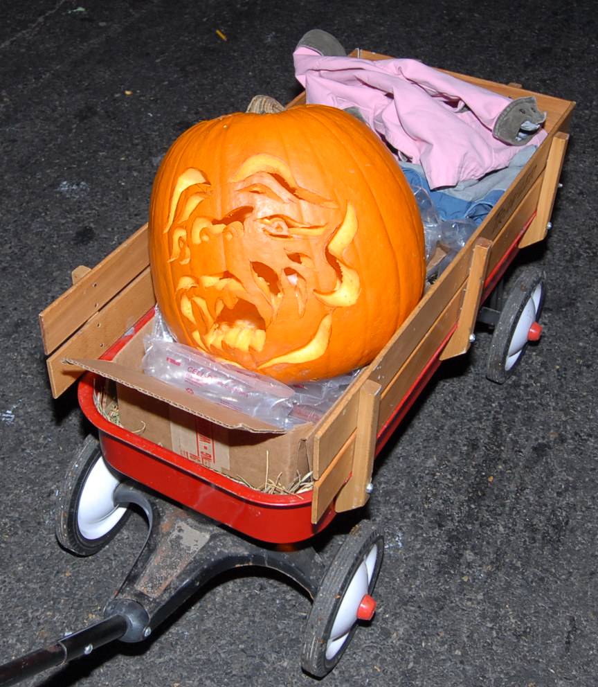 7:06 PM. Jack-o'-lantern in a wagon.