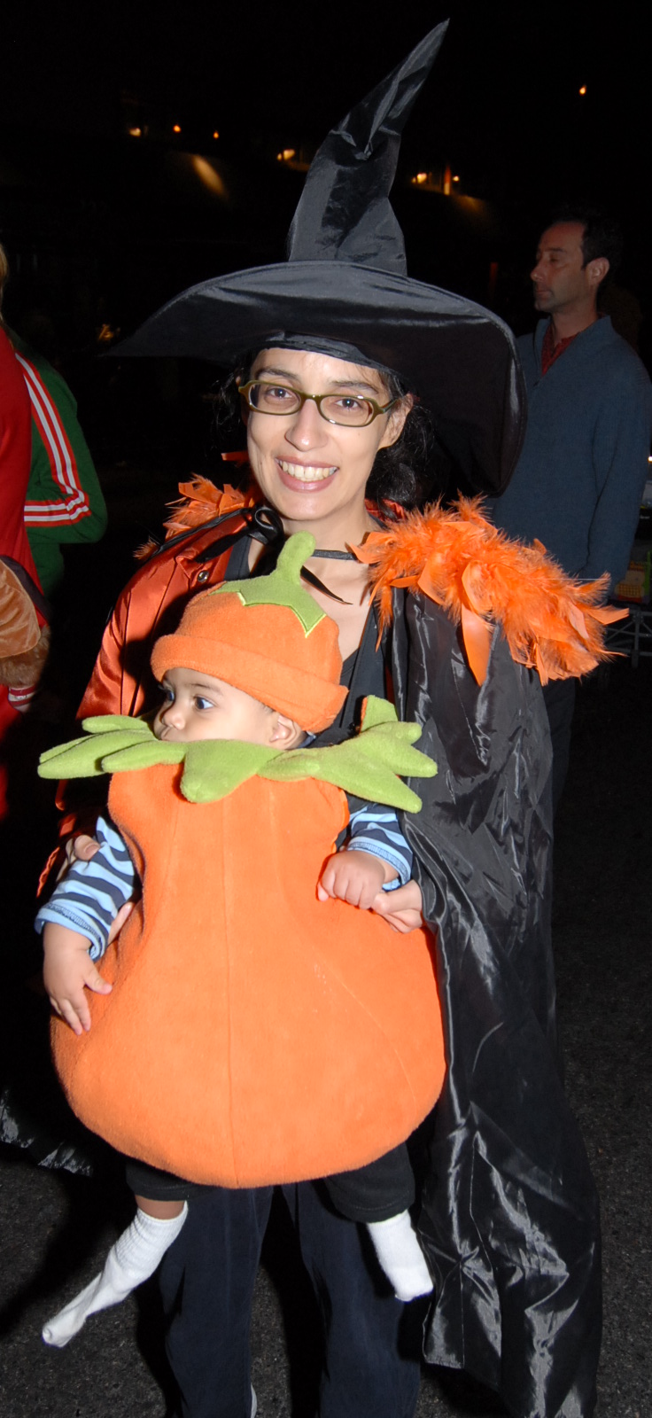 7:22 PM. A witch carrying an infant in a pumpkin costume.