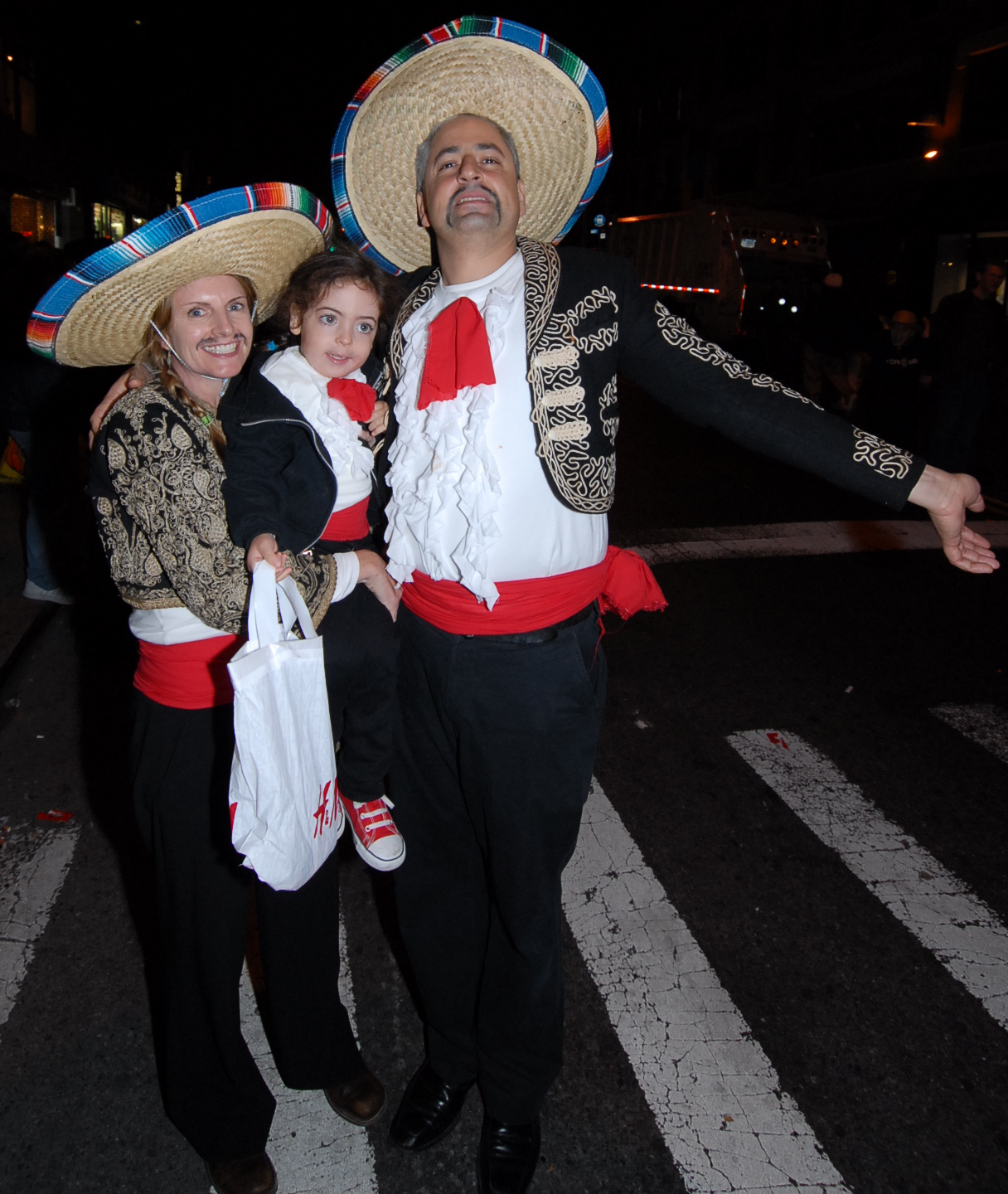 7:48 PM. Family wearing outfits that resemble mariachi or Mexican folk attire, complete with sombreros and embroidered jackets.