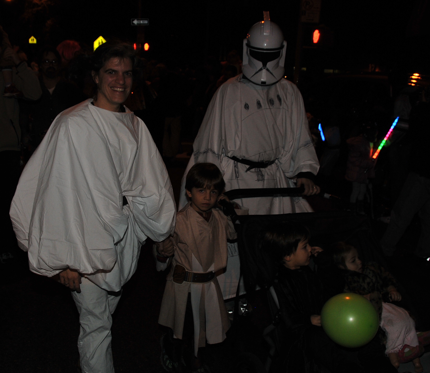7:18 PM. Star Wars costumes: Princess Leia, a stormtrooper, and a young Jedi.
