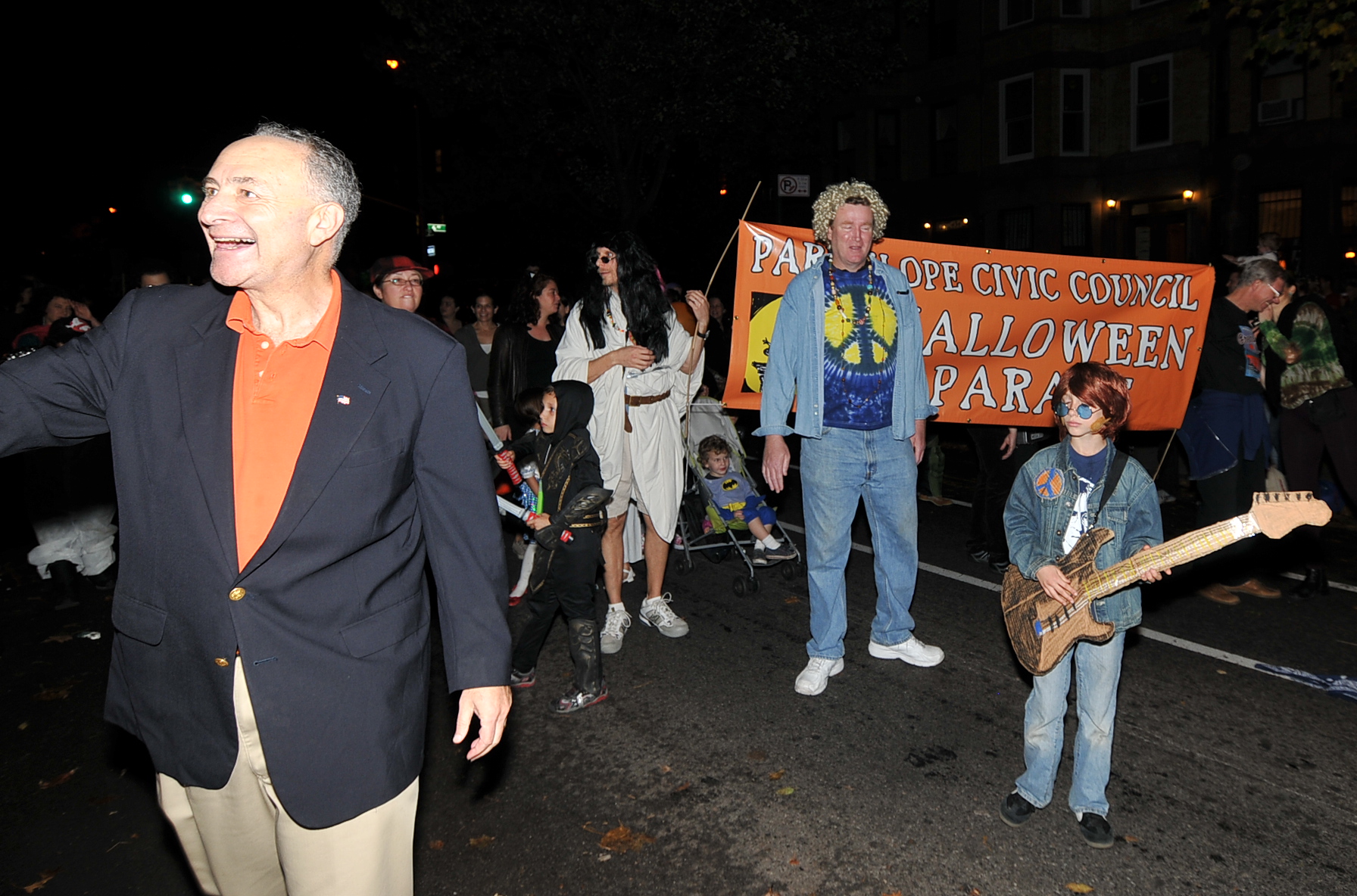 7:17 PM. Senator Chuck Schumer, a neighborhood resident, is telling the crowd that he is for the "public option." He wanted it too be included in that year's health care reform legislation.