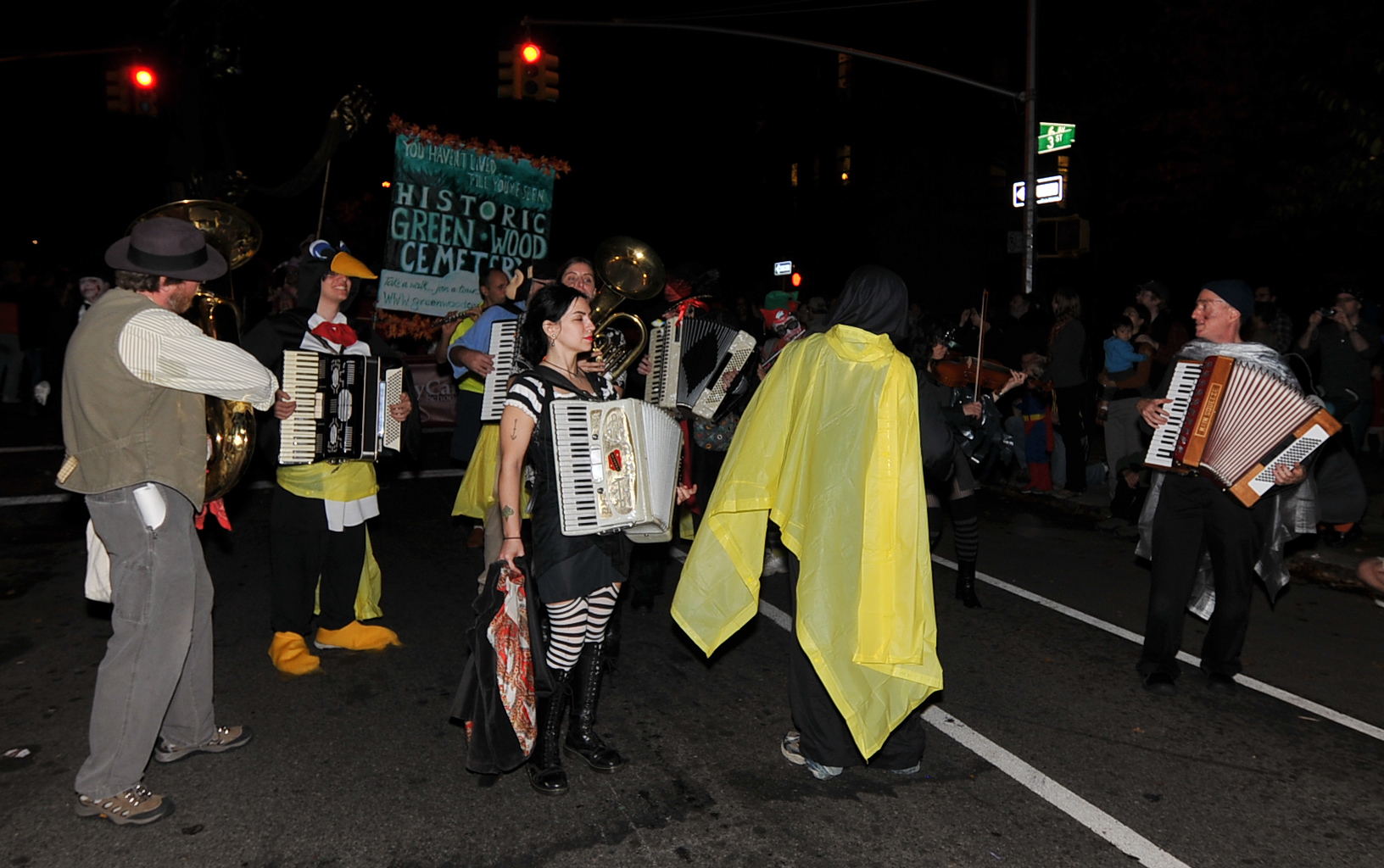 7:19 PM. A mostly accordion band. Behind is a banner for Historic Green-wood Cemetery.