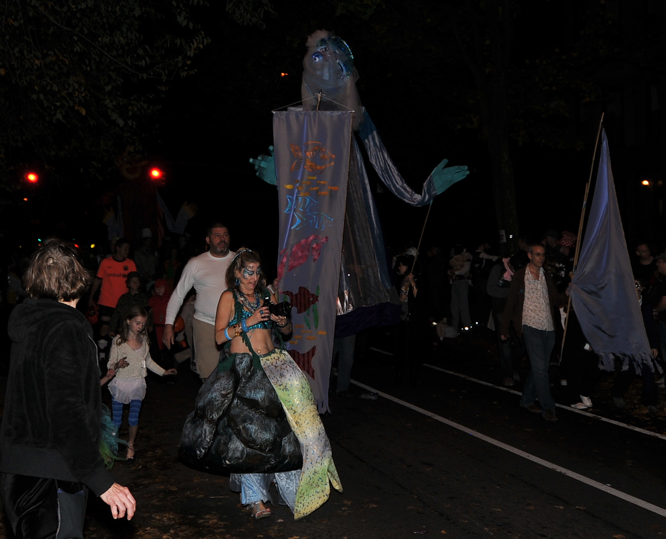 7:21 PM. A tall puppet behind. A banner with fish. Likely a mermaid in front.