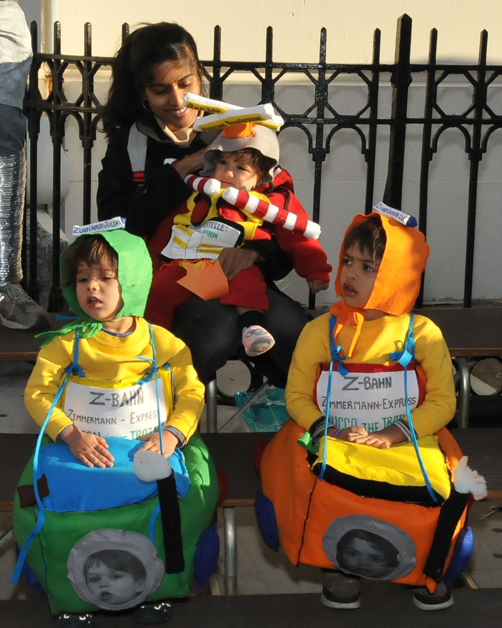 4:18 PM. Handmade train costumes for a "Z-BAHN Zimmermann Express" train, also known as "BICCO THE TRAIN."