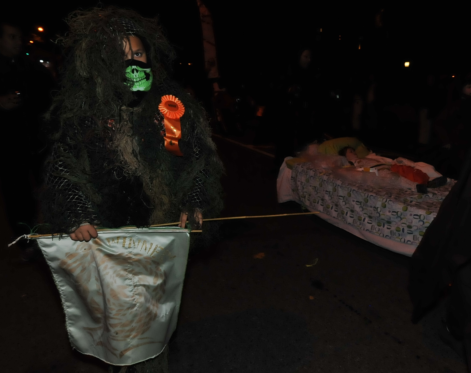 7:04 PM. A woman wearing a skull mask. Represents? At right is a child sleeping in bed. Bed bug bait.