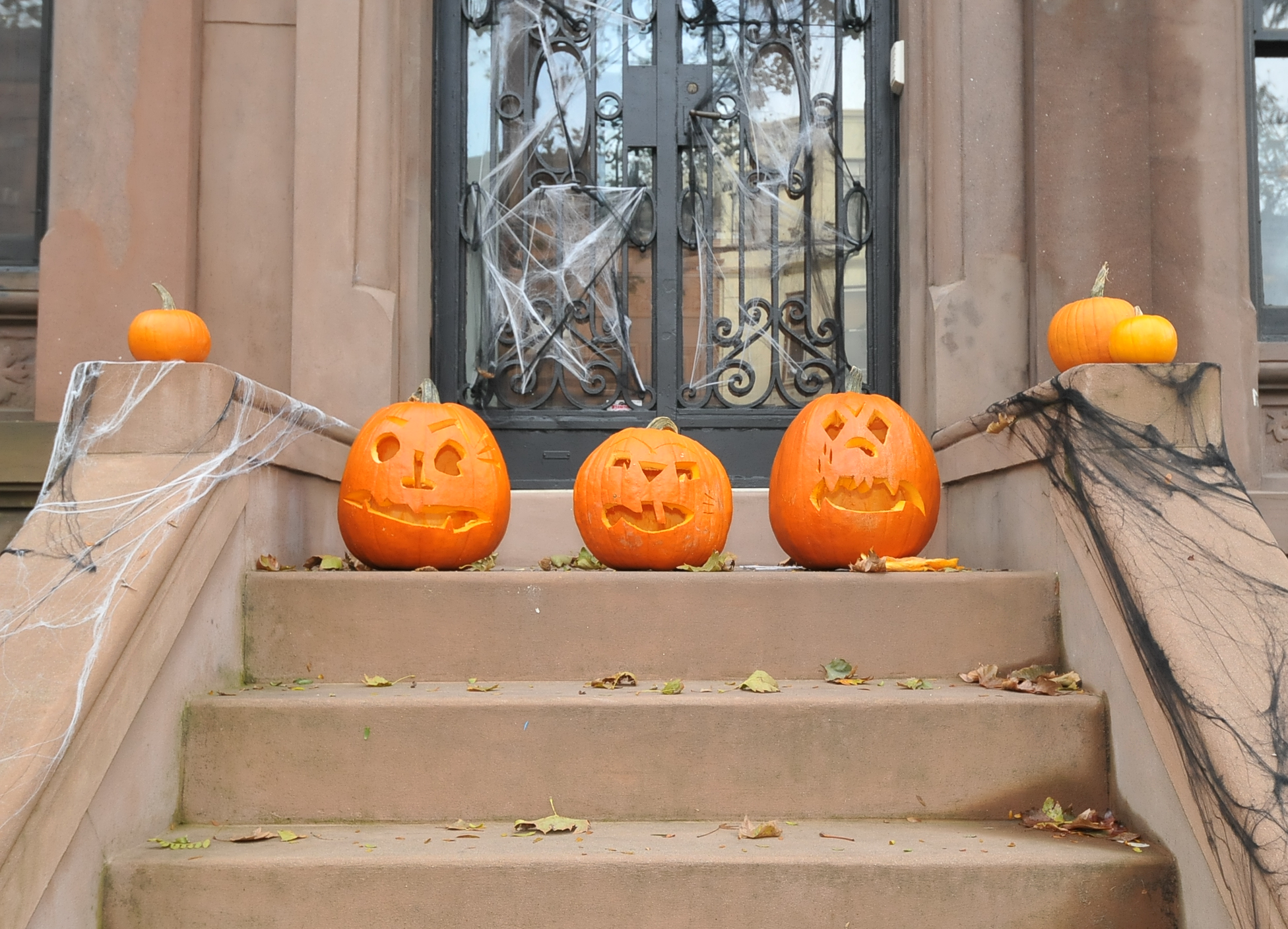 3:24 PM. Three jack-o'-lanterns on a stoop.