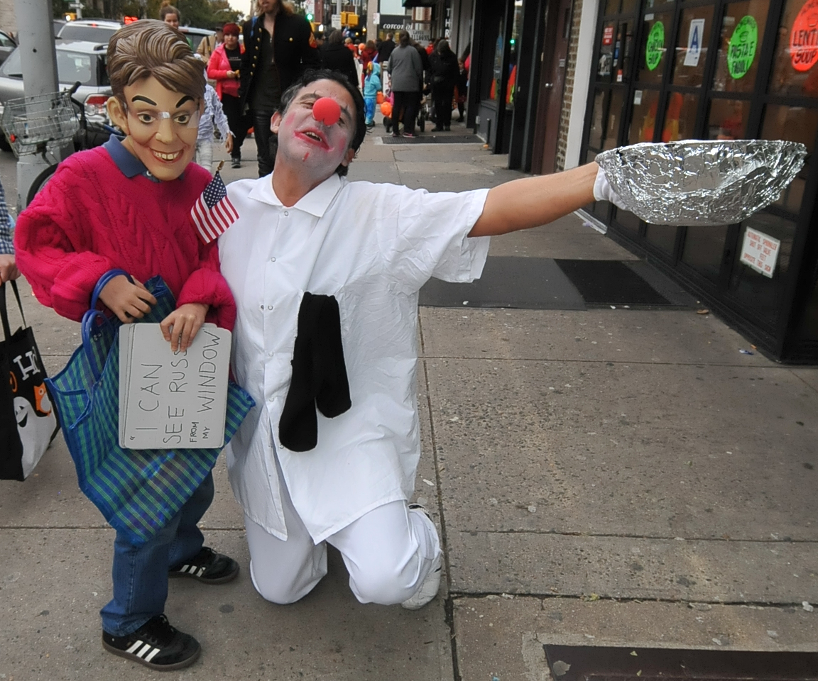 5:11 PM. Sarah 'I can see Russia from my window' Palin, and the fellow from Joe's On 7th Ave Pizza dressed as a clown.