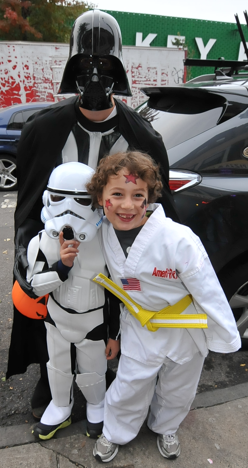 5:18 PM. Adult is Darth Vader, children are a Star Wars Stormtrooper and a karate gi with a yellow belt.