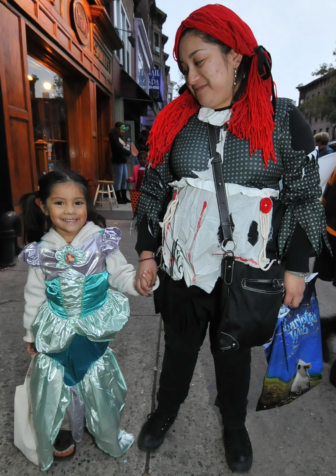 5:41 PM. Little Mermaid Ariel Shimmer costume and Raggedy Ann doll.