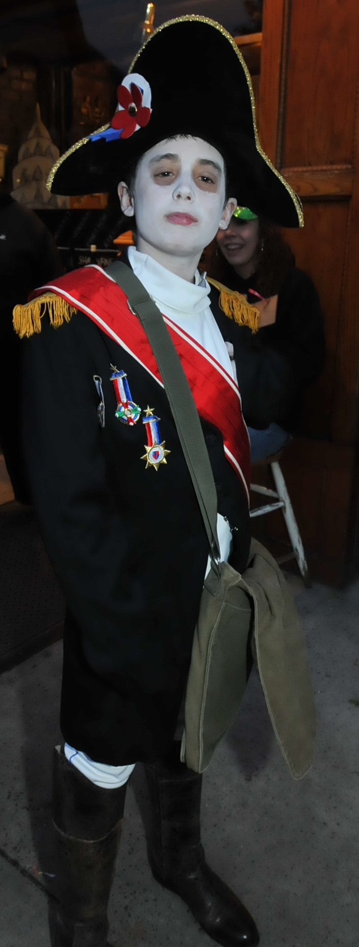 5:53 PM. Napolean Bonaparte. The costume includes a military-style tailcoat jacket with epaulets and a sash, a white jabot or shirt front, and a tricorne hat.