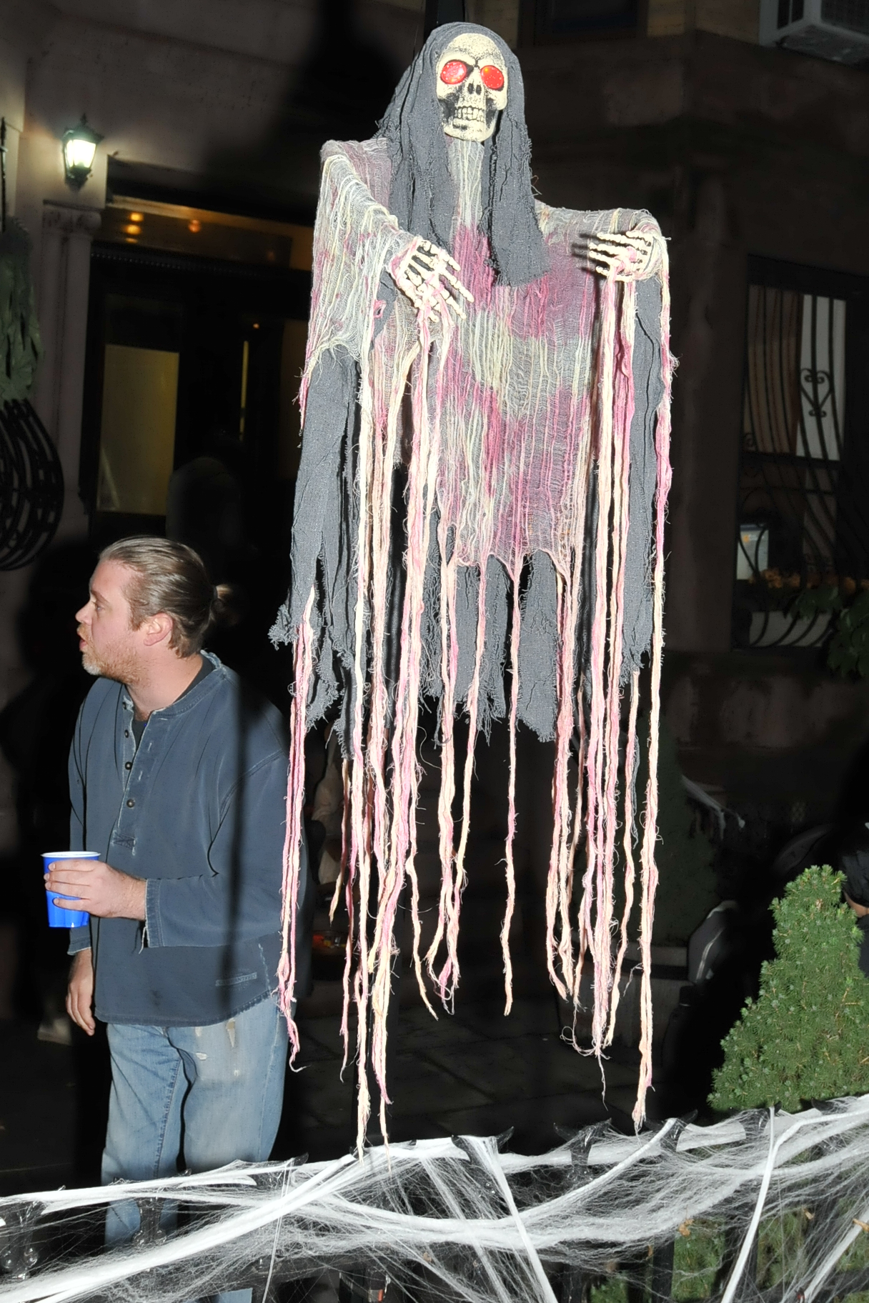 6:52 PM. A hanging grim reaper in a front yard. The eyes light up.