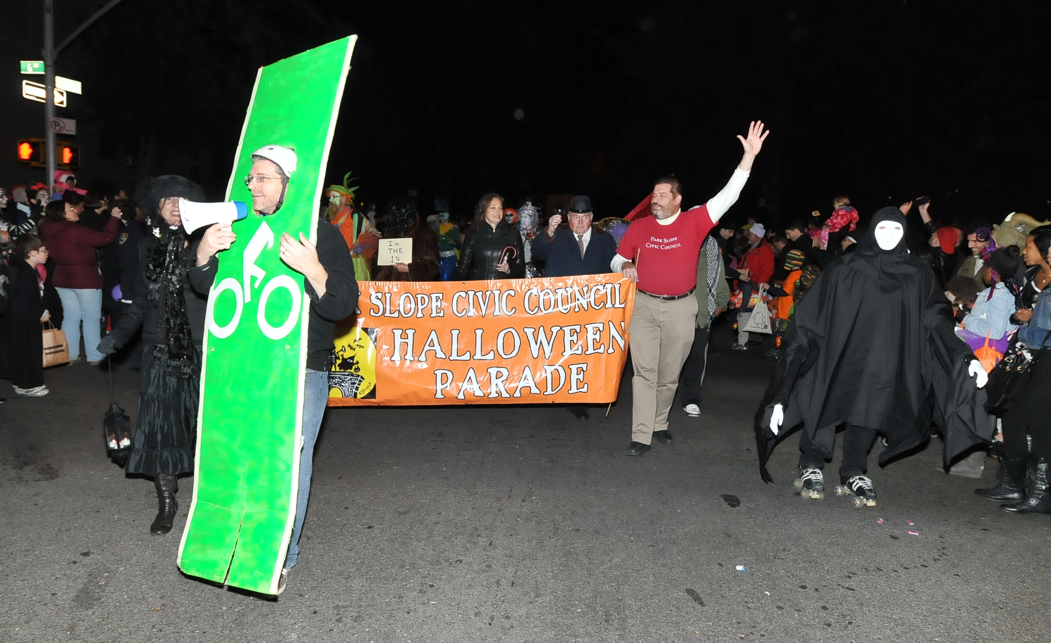 7:12 PM. Gersh Kuntsman, in the Prospect Park West bicycle lane costume, is the Editor of The Brooklyn Paper. Michael Cairl, in the red shirt, is president of The Park Slope Civic Council, the sponsors of the parade.