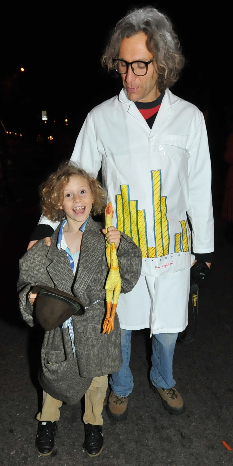 7:32 PM. Charlie Chaplin's The Tramp holding a rubber duck. Scientist has graph showing hair length by age.
