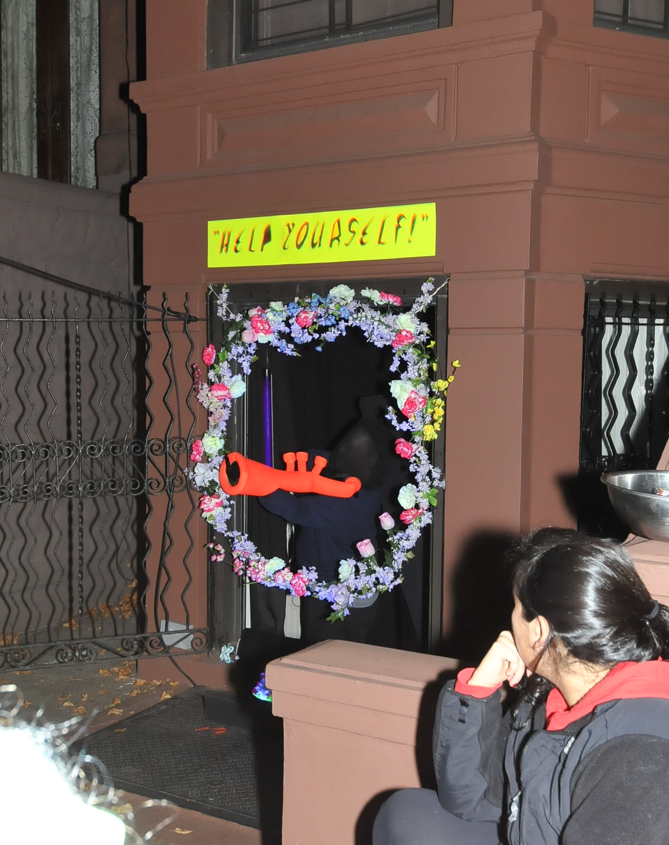 8:32 PM. A house on Garfield Place (between Fiske and Polhemus) has a periodic puppet show. See in two pictures hence what it really looks like, without the flash revealing all.