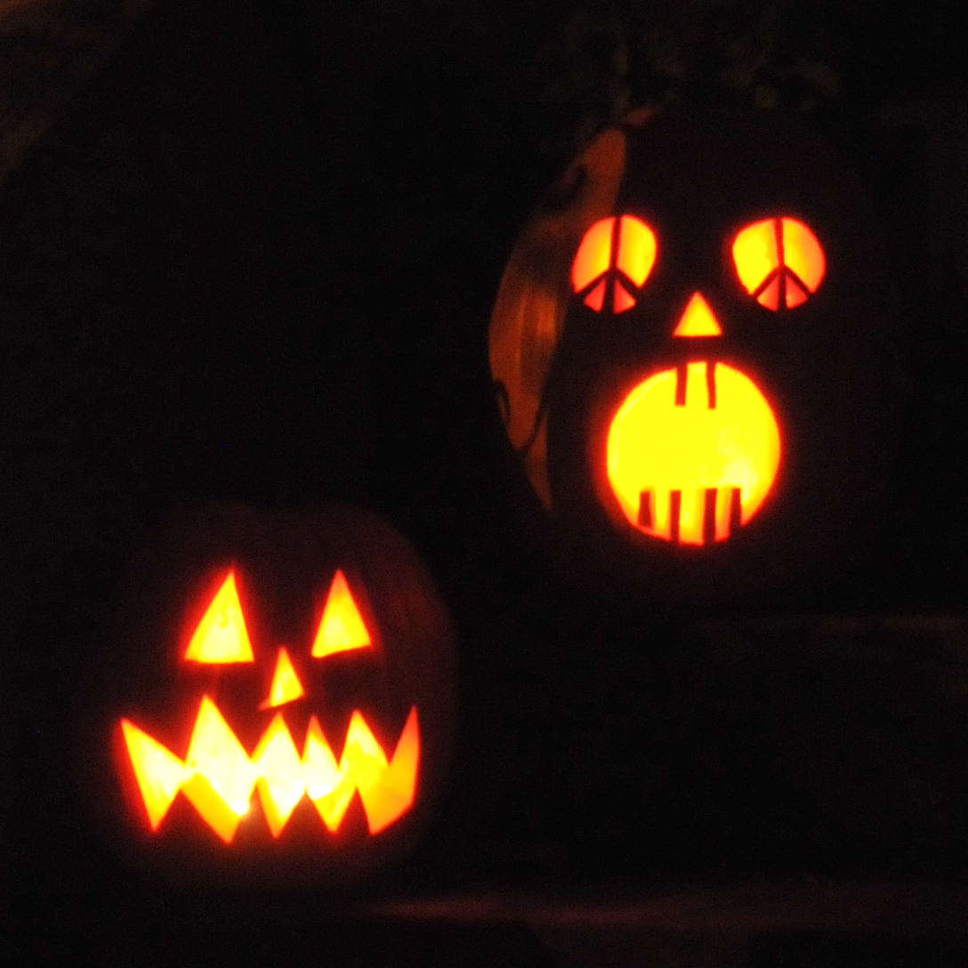 8:46 PM. Two lit jack-o'-lanterns. Without a flash.