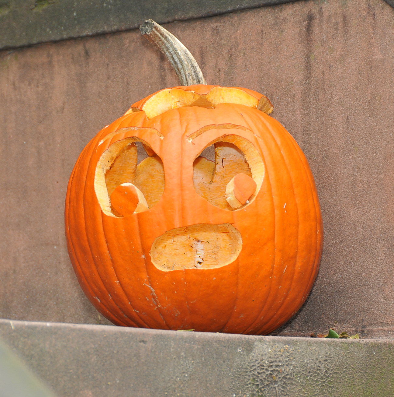 3:14 PM. A Jack-o'-lantern on a stoop.