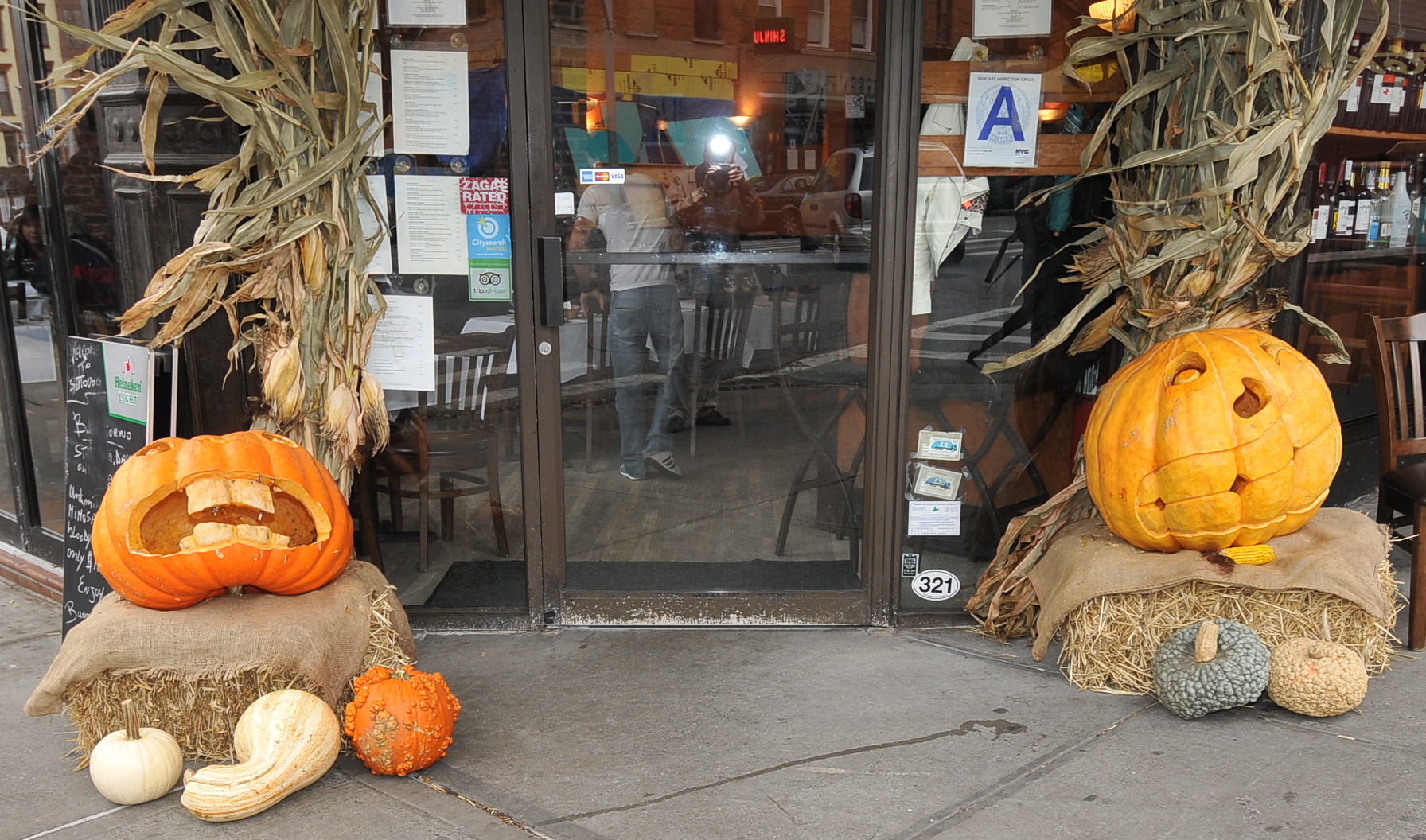 3:20 PM. Two jack-o'-lanterns at the entrance to