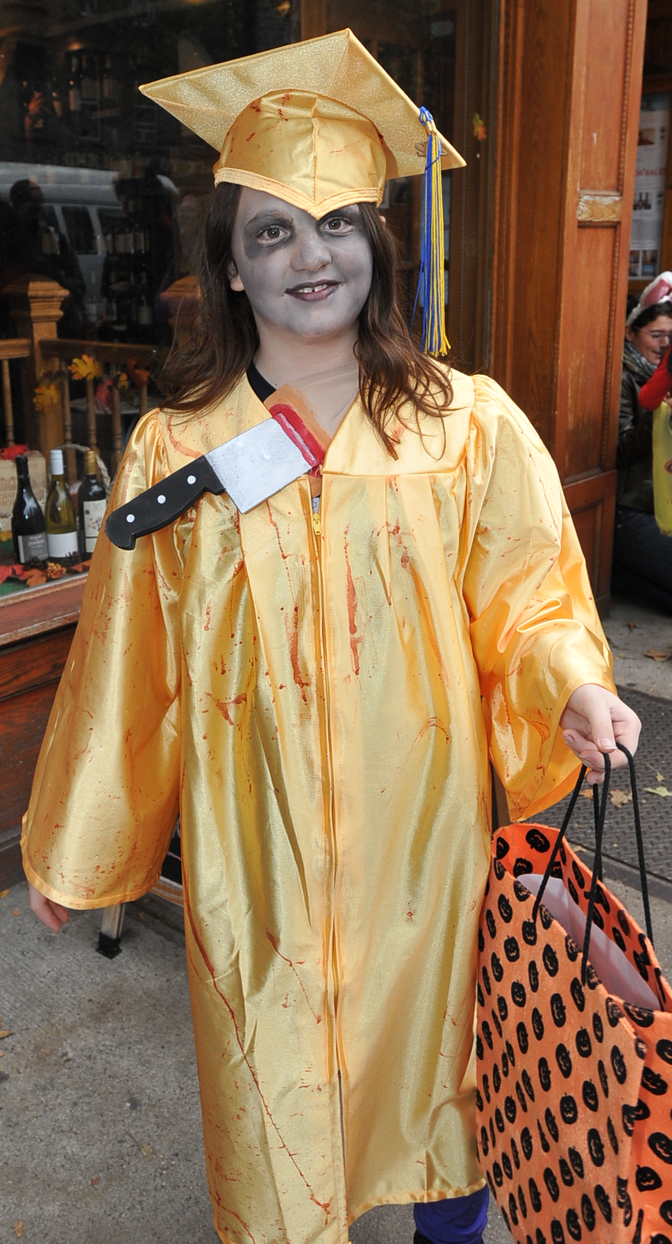 4:04 PM. A zombie in a graduation gown and cap. Since dying, the zombie has not removed the knife that killed her.