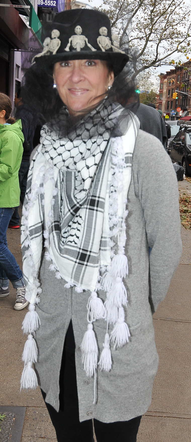 4:20 PM. Wearing a hat with skeletons and a Palestinian Keffiyeh.