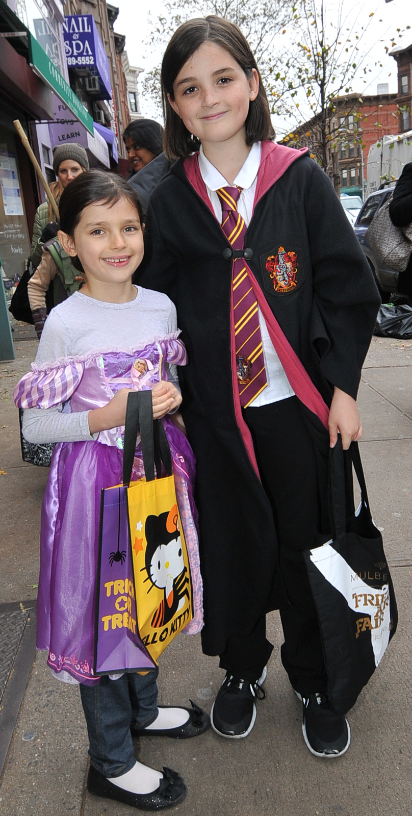 4:28 PM. A Rapunzel-inspired princess costume, the other wearing a Harry Potter Gryffindor robe and tie.