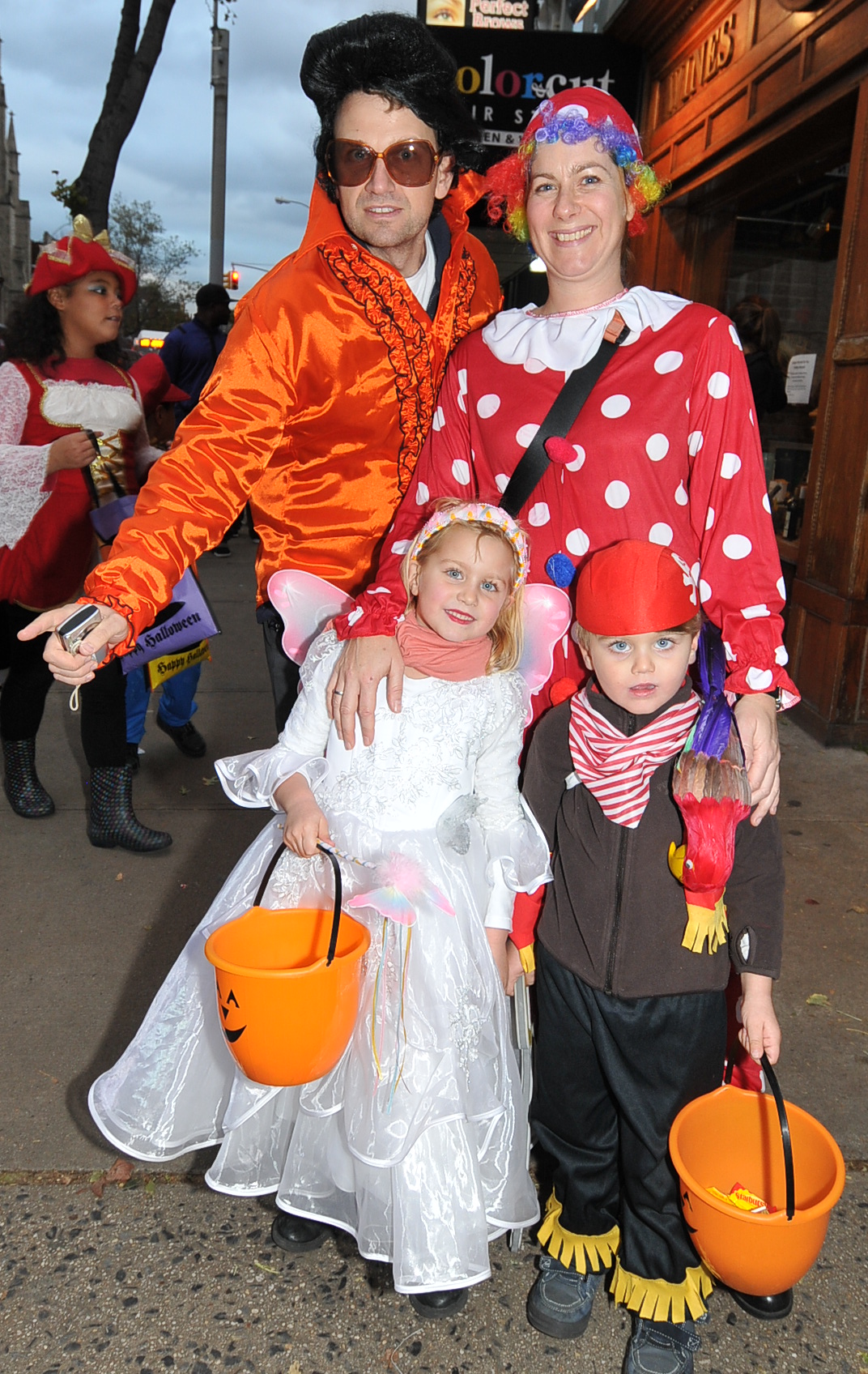 5:14 PM. A 1970s-era Elvis Presley, a clown, with a little princess and a pirate (see his parrot).