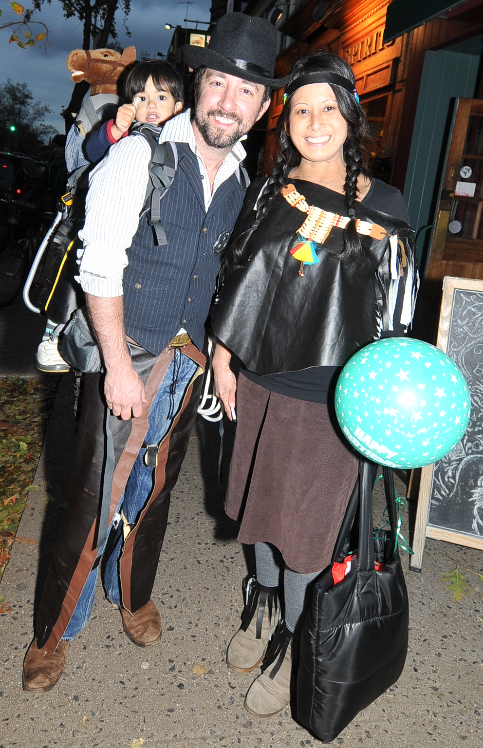 5:48 PM. A cowboy sheriff, and woman dressed in a Native American-inspired costume.