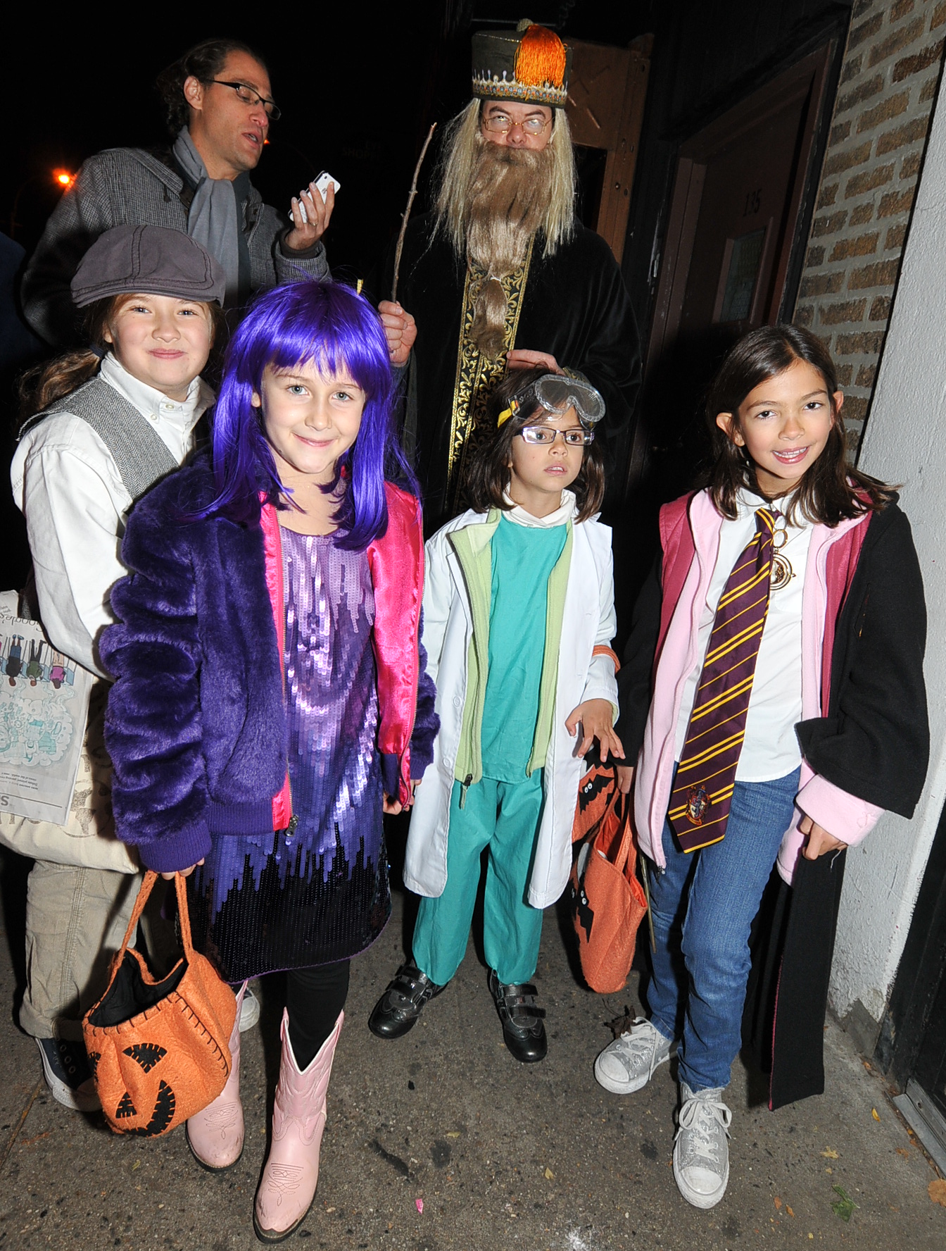 6:16 PM. In back, Professor Dumbledore, the Headmaster of Hogwarts. Across front: a tramp?, a purple witch, mad scientist, and Hermione Granger from Harry Potter.