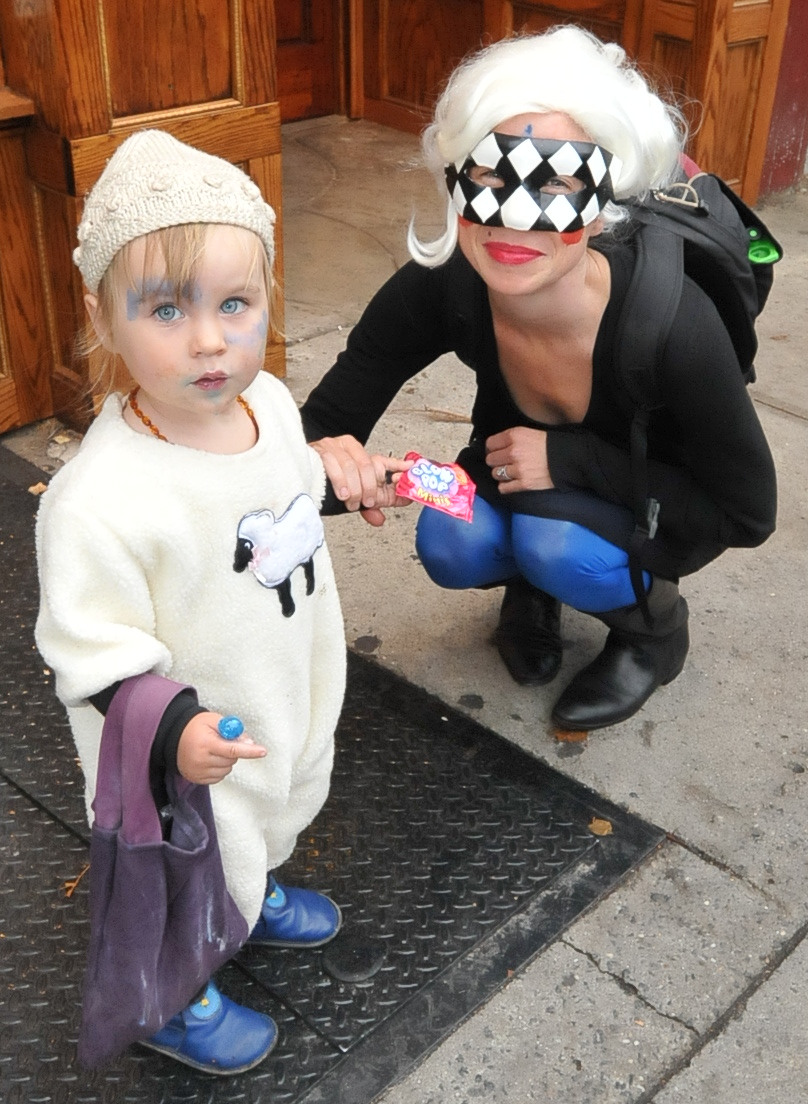 4:31 PM. A little lamb. Mom is a jester, wearing a Black and White Harlequin Mask from Candy Apple Costumes.