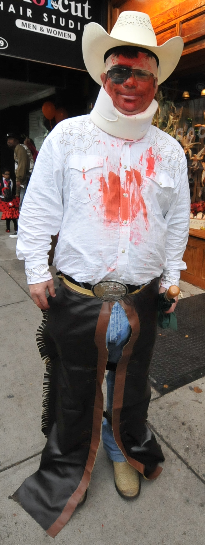 4:34 PM. A bloody one-eyed cowboy wearing chaps. With a neck brace, he was in an accident. Maybe, thrown from his horse.