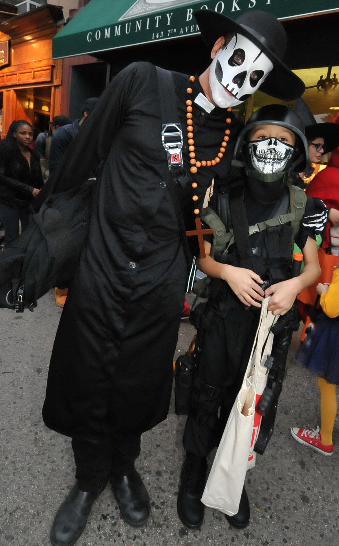 5:23 PM. A skeleton priest costume, and the child is a skeleton wearing a tactical-style outfit with a helmet.