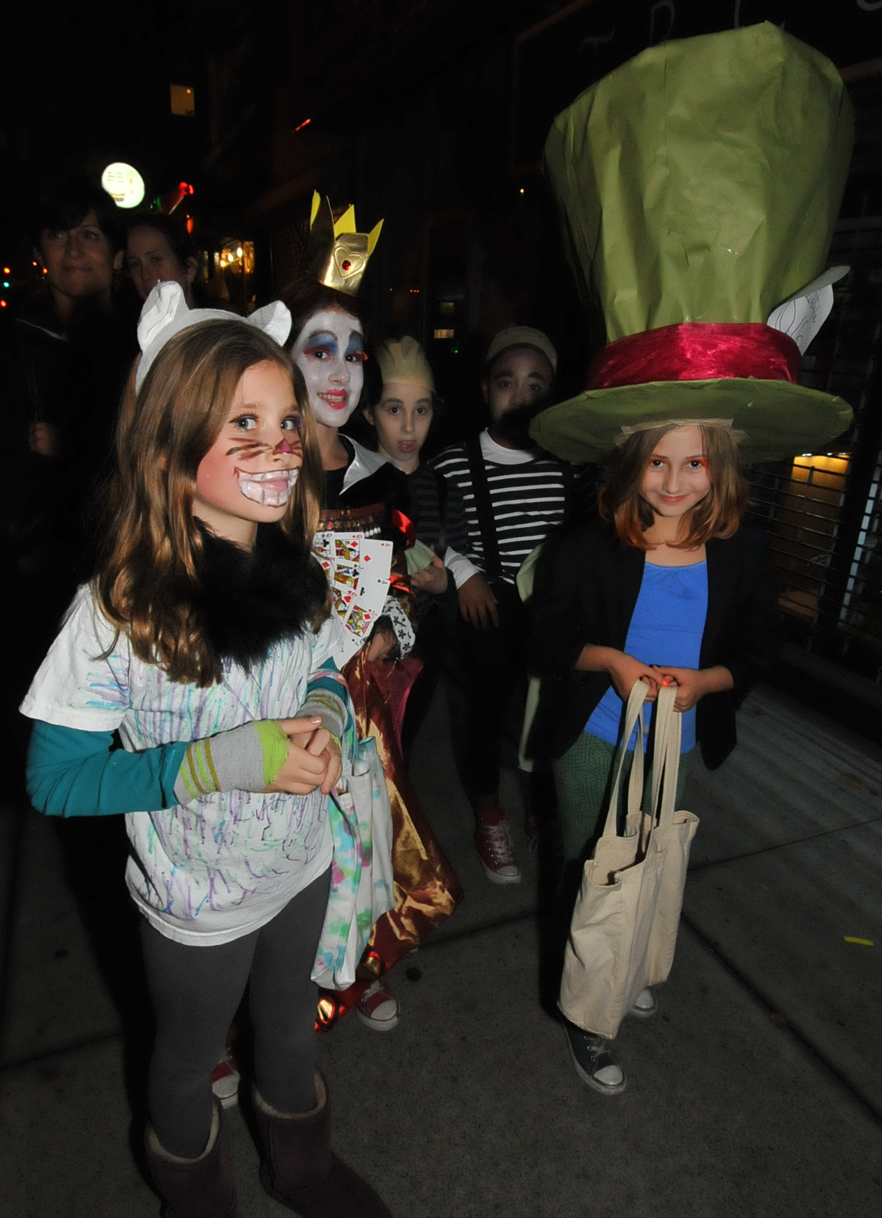 : Cheshire Cat, Queen of Hearts, ?, Tweedle Dee or Tweedle Dum, and the Mad Hatter.