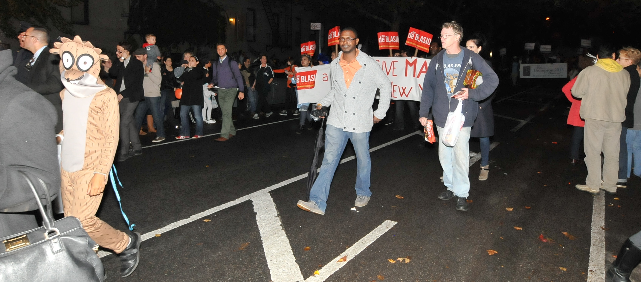 7:14 PM. Banners for Bill De Blasio for mayor. At left is Rigbie (a raccoon) a main character in