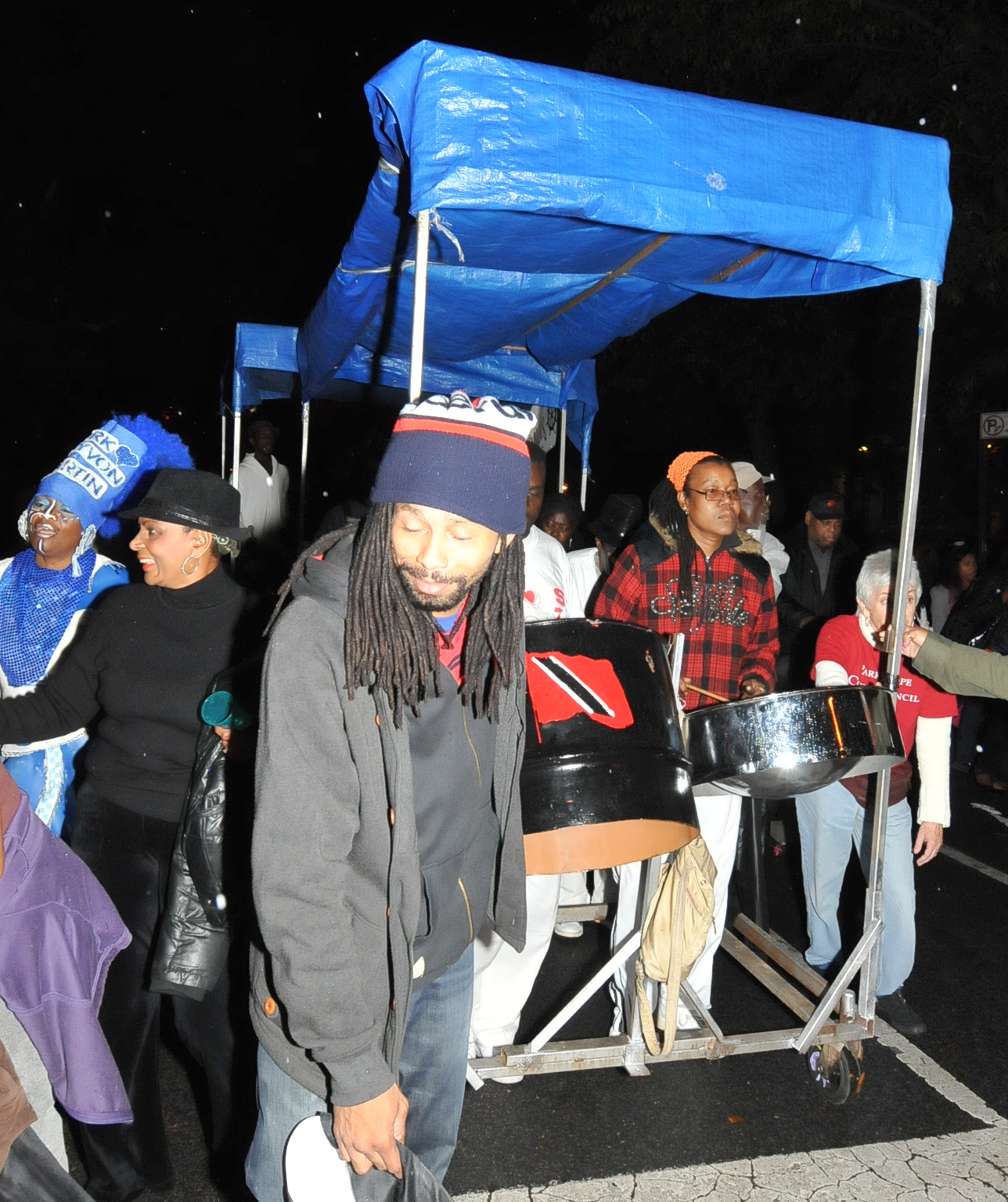 7:50 PM. A small steel drum band came along after most of the parade passed by.