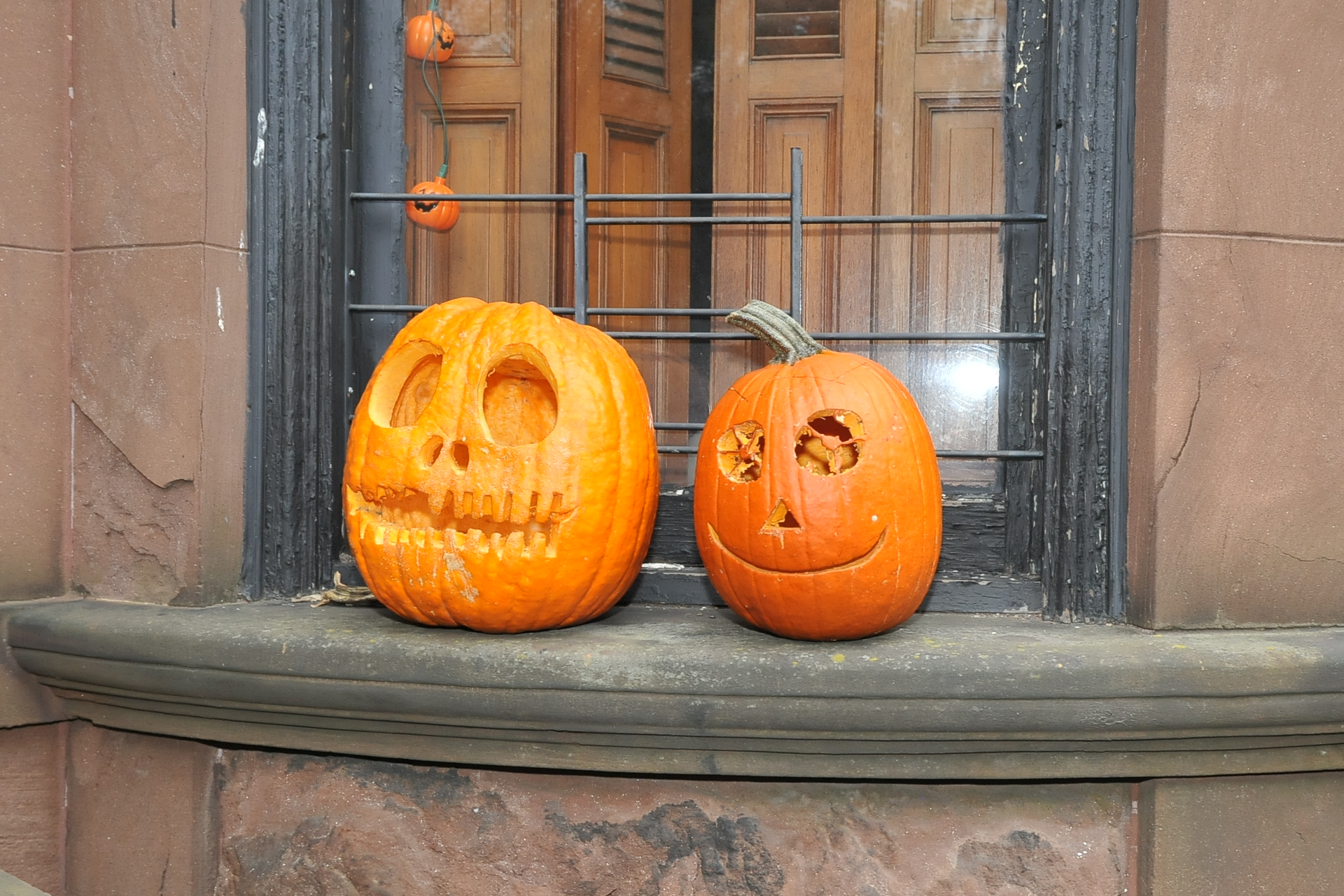 3:38 PM. Two jack-o'-lanterns. A neighbor on my block.