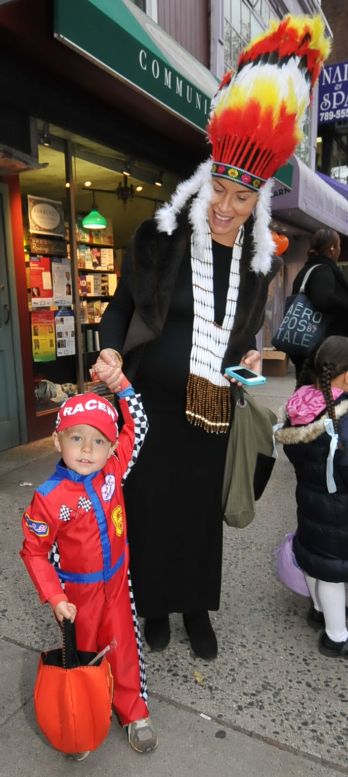4:52 PM. A NASCAR race car driver costume, and a headdress similar to a Plains Indian war bonnet.