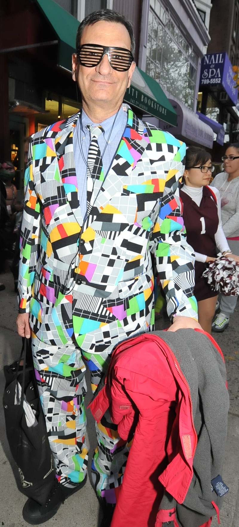 5:20 PM. A "Testival" suit by the brand OppoSuits. He's wearing slatted sunglasses, also known as "shutter shades."