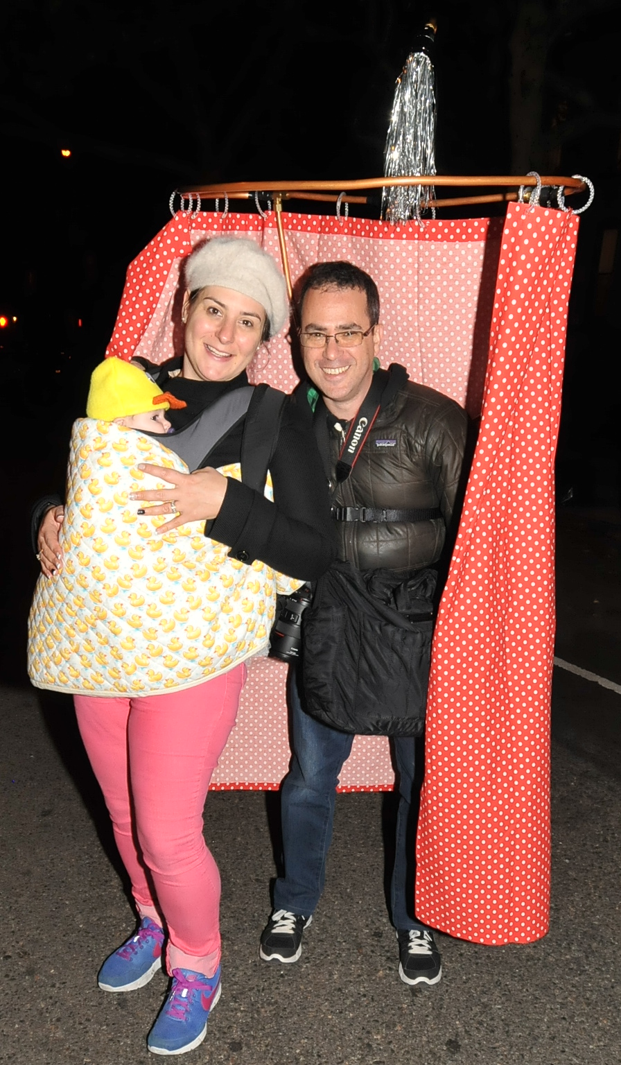 6:59 PM. A couple in a shower with their infant in a baby chick hat.